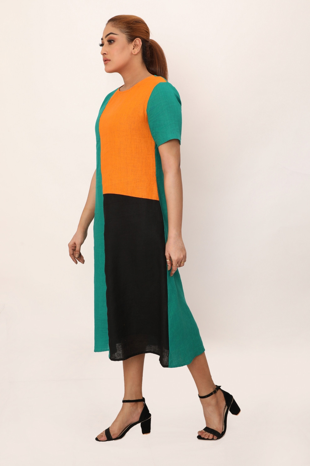 The Alba dress offers a bold take on contemporary colour-blocking. Designed with a simple round neckline and short sleeves, this midi-length dress features striking geometric panels that give it a modern edge. The clean lines and relaxed silhouette make it easy to wear, while the breathable fabric ensures comfort throughout the day. Perfect for casual outings or a statement look, this dress brings a playful yet refined touch to any wardrobe.