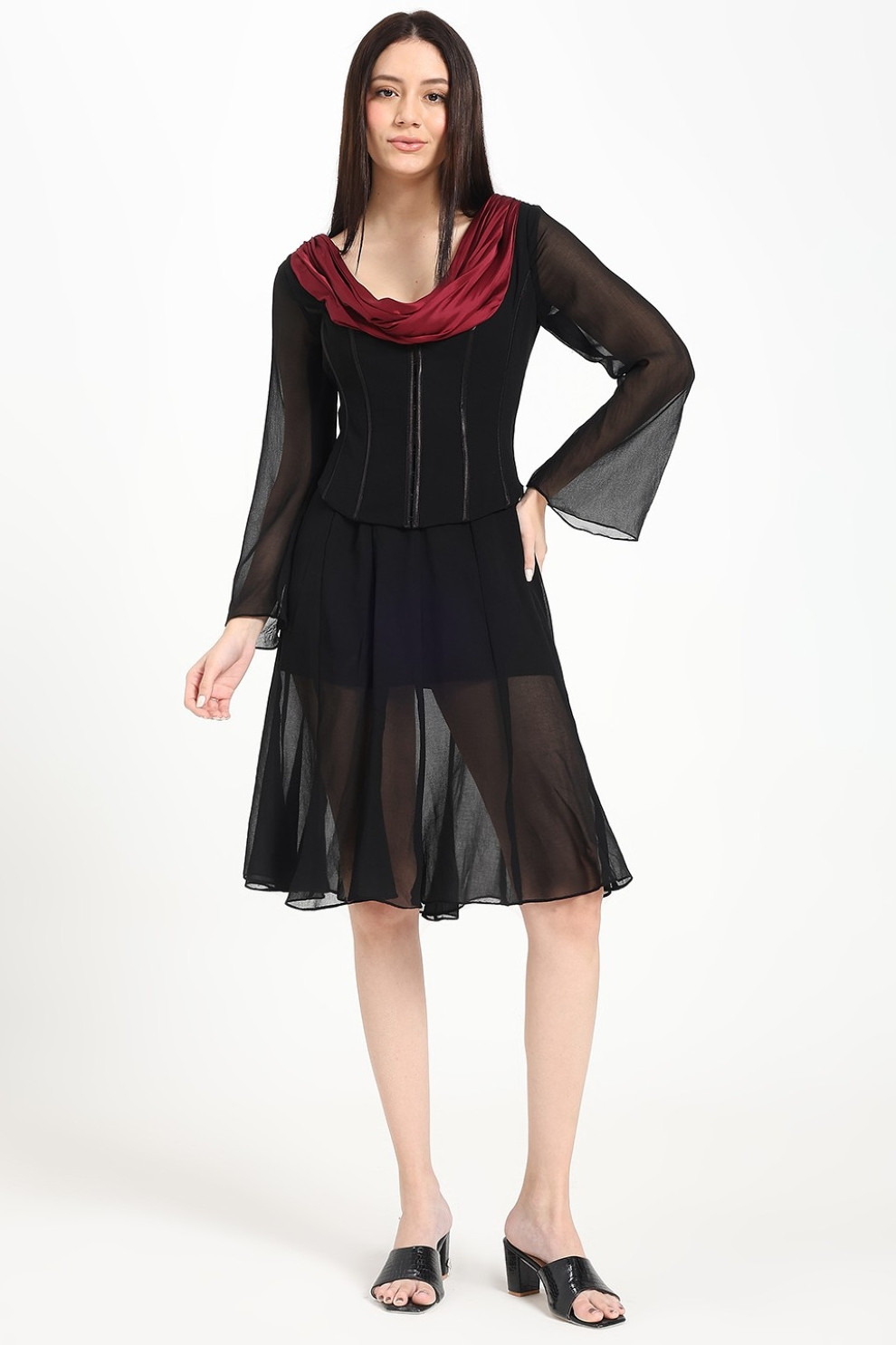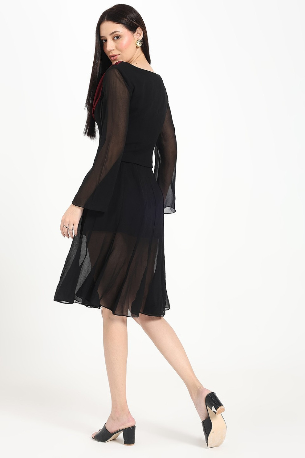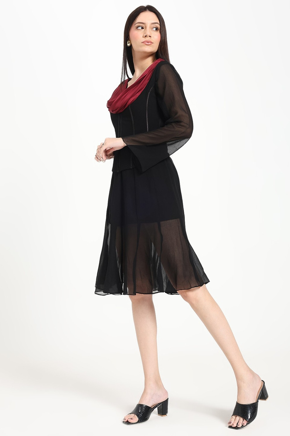 Graceful movement meets understated sophistication in this multi-panel midi skirt. Crafted from airy georgette, it drapes beautifully with every step, offering both comfort and charm. The silhouette is fitted at the hips to flatter your natural shape, then flares out effortlessly at the hem for a soft, feminine flow