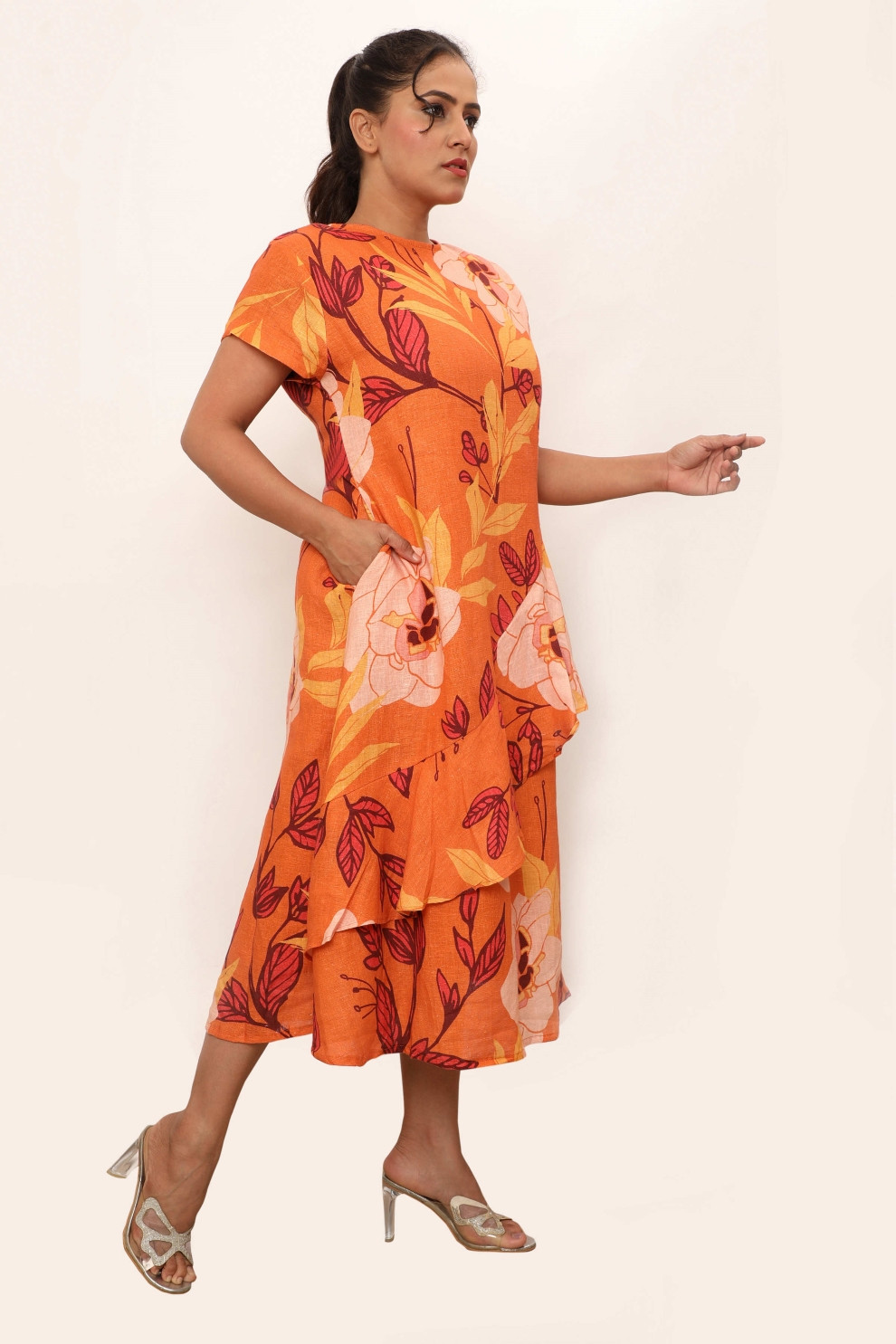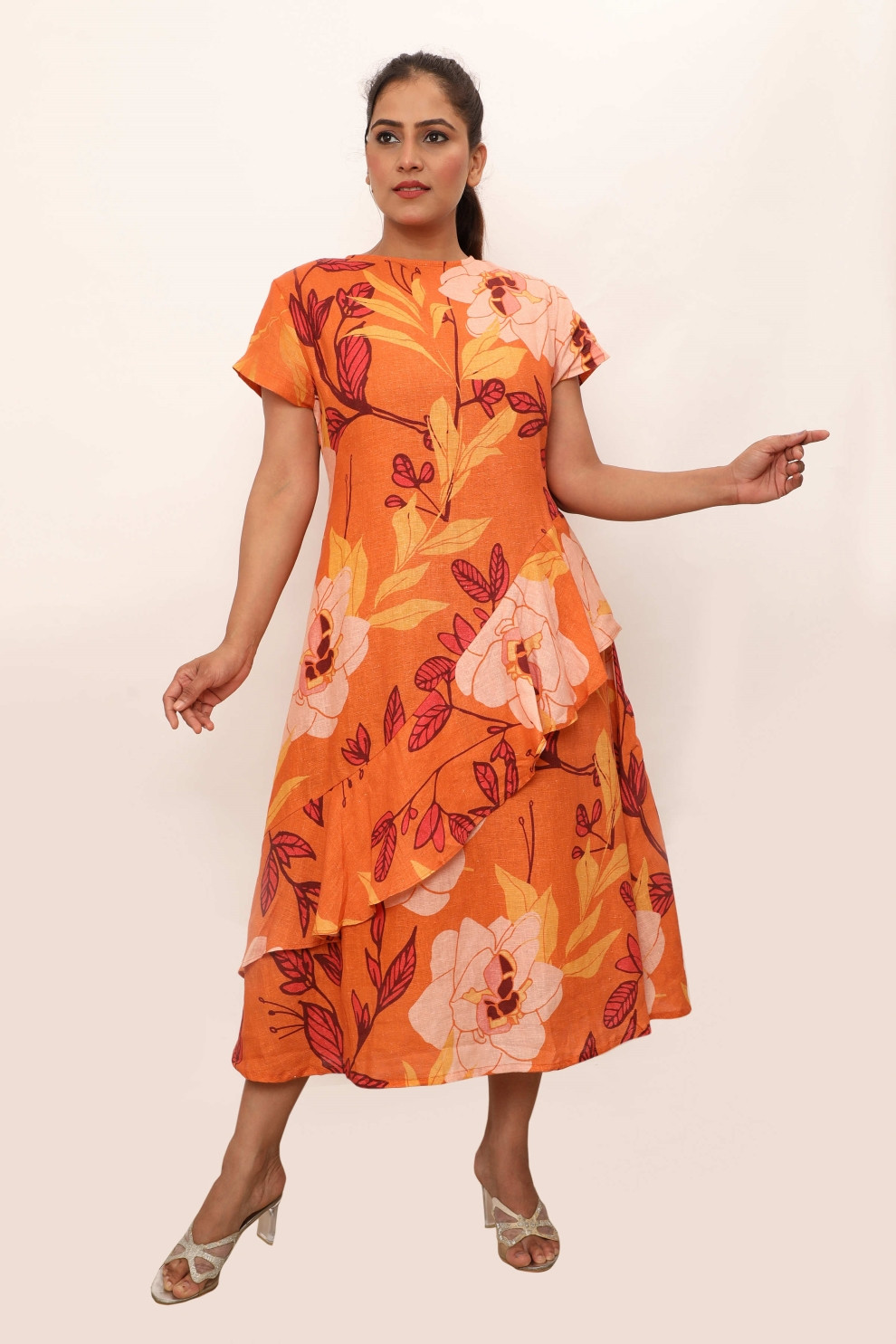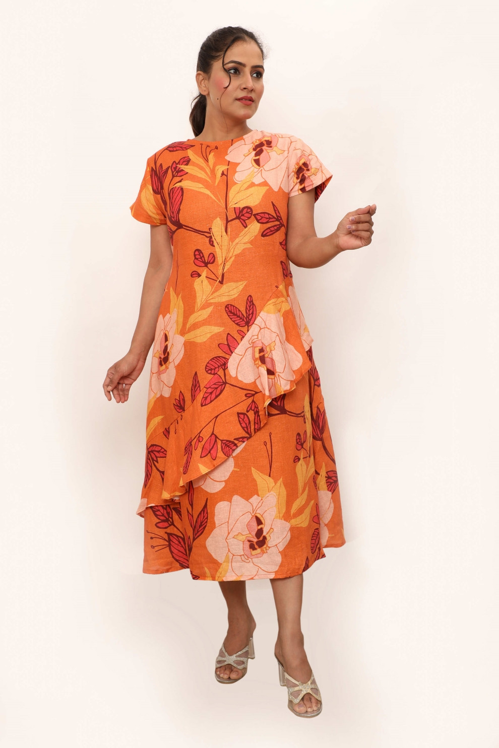 The Athena Dress - a vibrant and elegant addition to your wardrobe. This midi dress features a striking orange floral print that exudes warmth and charm. Designed with short sleeves and a stylish ruffle detail cascading down the front, it adds a touch of sophistication and movement to your silhouette. Pair the dress with strappy sandals and delicate jewellery for a refined daytime look. For an evening event, elevate the ensemble with heels and a statement clutch.
