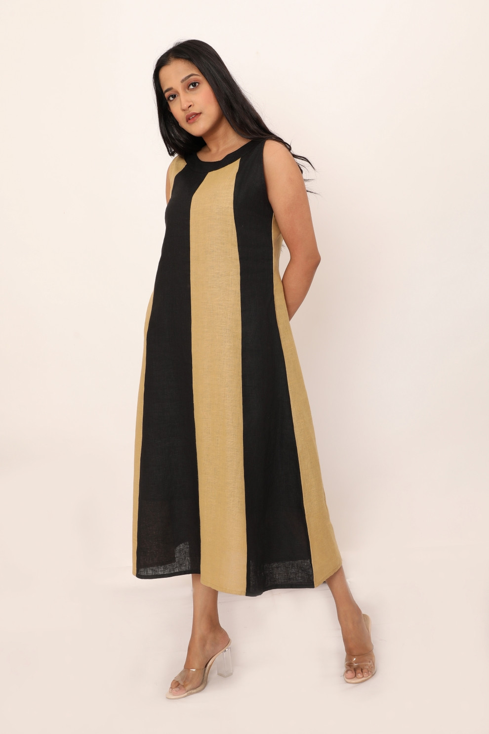 Our Aurora dress combines timeless elegance with a bold, modern flair. Its structured A-line silhouette is brought to life with striking colour-blocked panels that offer a flattering vertical design. Crafted in breathable, lightweight linen, this dress is perfect for those who appreciate both comfort and style. The sleeveless design and relaxed fit make it a versatile option for a range of occasions. Paired with statement heels or casual flats, Aurora effortlessly transitions from day to night, embodying confidence and simplicity in every step.