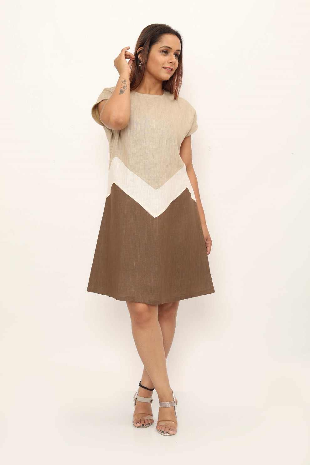 Introducing the Avalon Dress - a chic shift dress that effortlessly blends style and comfort. Featuring cap sleeves and colour-blocking details for added visual interest, this dress exudes contemporary charm. A V-shaped joint along the waist enhances the silhouette, offering a flattering and stylish look. Perfect for brunch with friends, a day at the office, or an evening out, the Avalon Dress is sure to make a statement wherever you go.