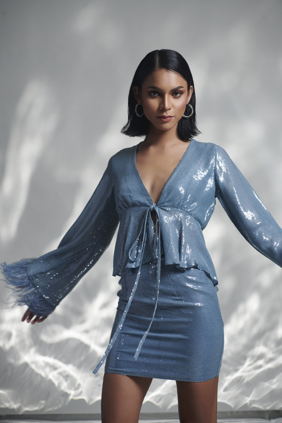 A sequin variation of our white satin feather top, 'cause, why not?! This top is complete with playful feather detailing and dramatic long bell sleeves that flutter with every gesture and a front tie up closure that highlight your femininity. It’s the ultimate conversation starter, whether you're sipping cocktails at a rooftop bar or dancing the night away at an exclusive soiree.