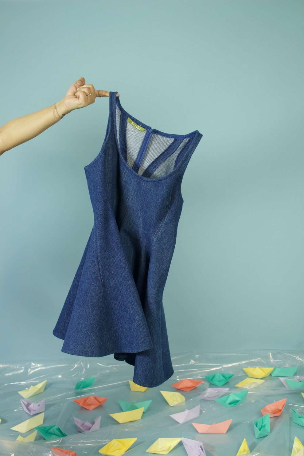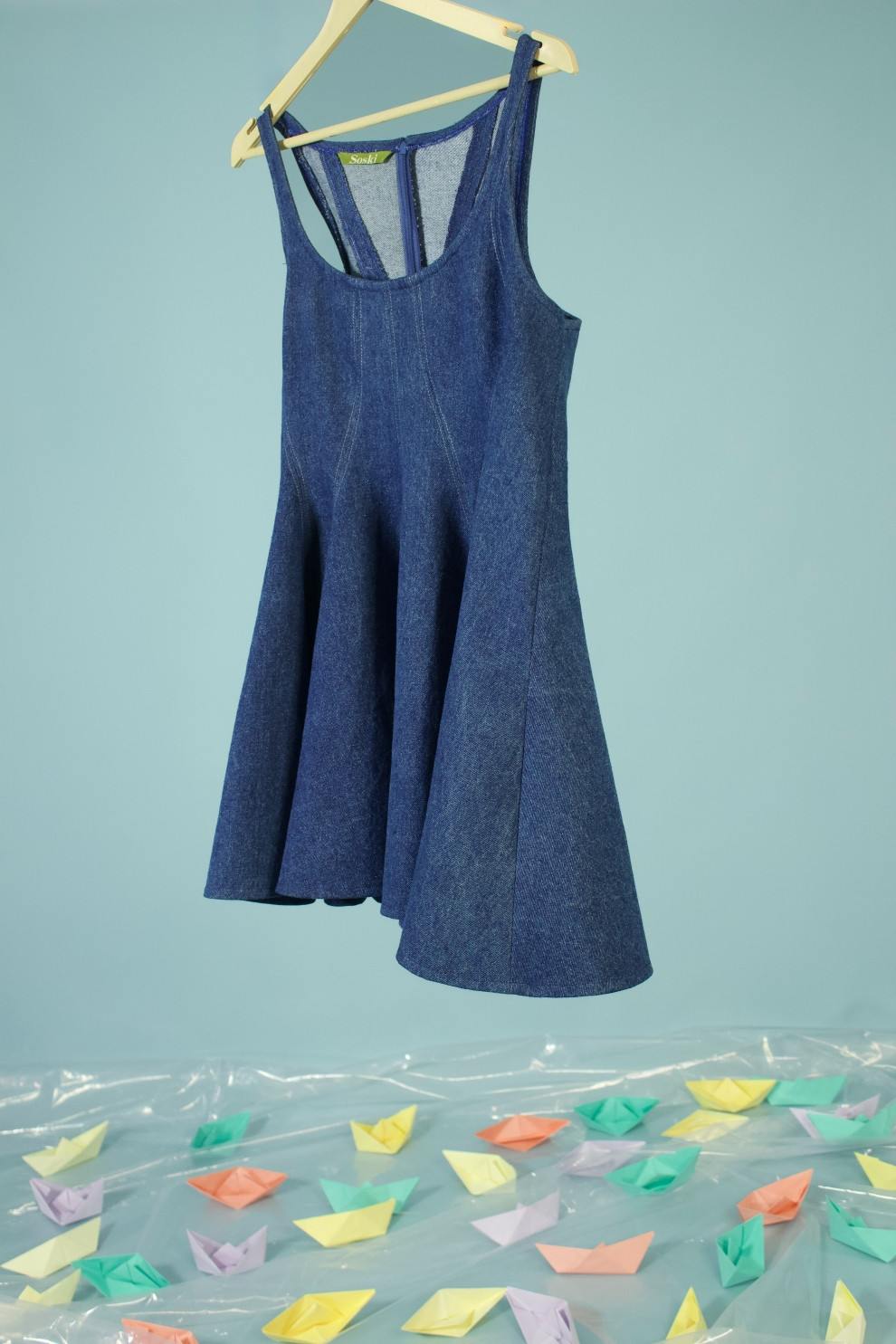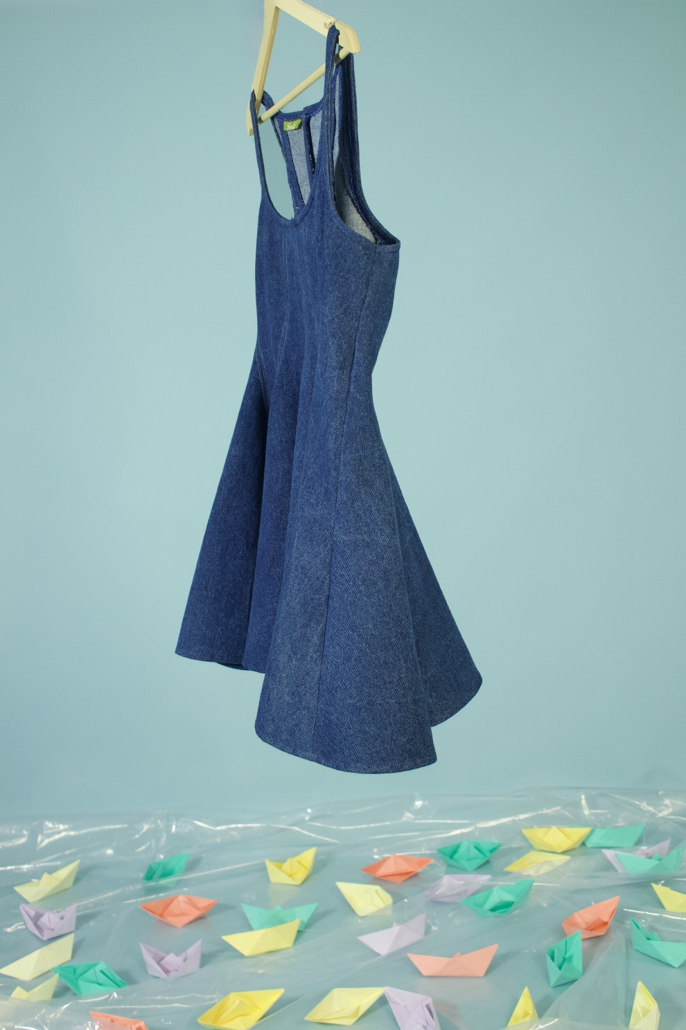A flattering flounce A-line denim dress with contrast stitching tracing playful wavy seams. Crafted in luxe dark blue denim with a deep scoop neck — it’s effortless, easy, and made to turn heads.