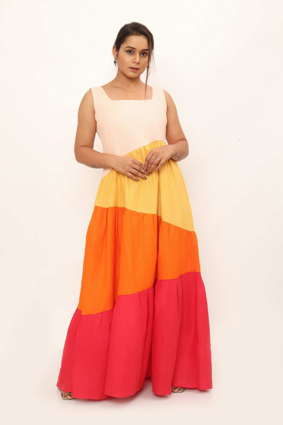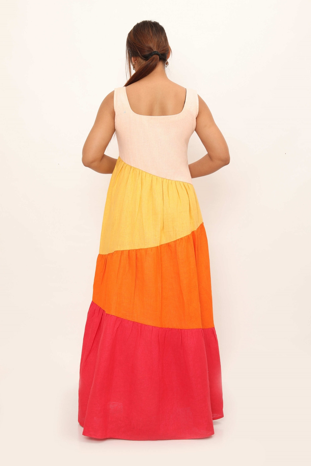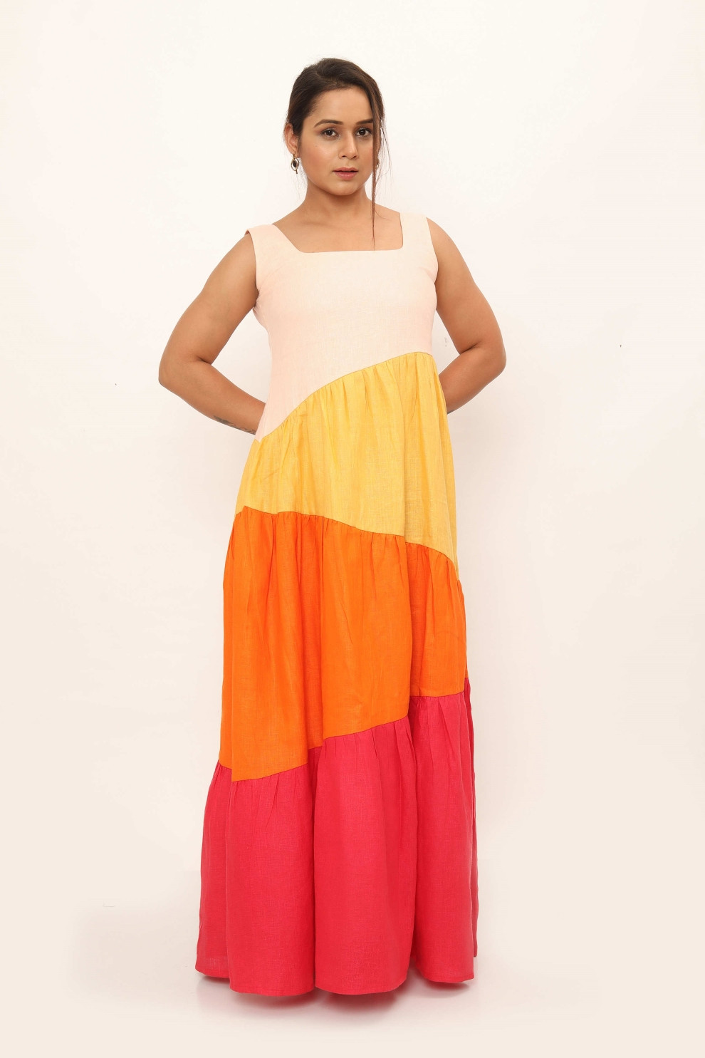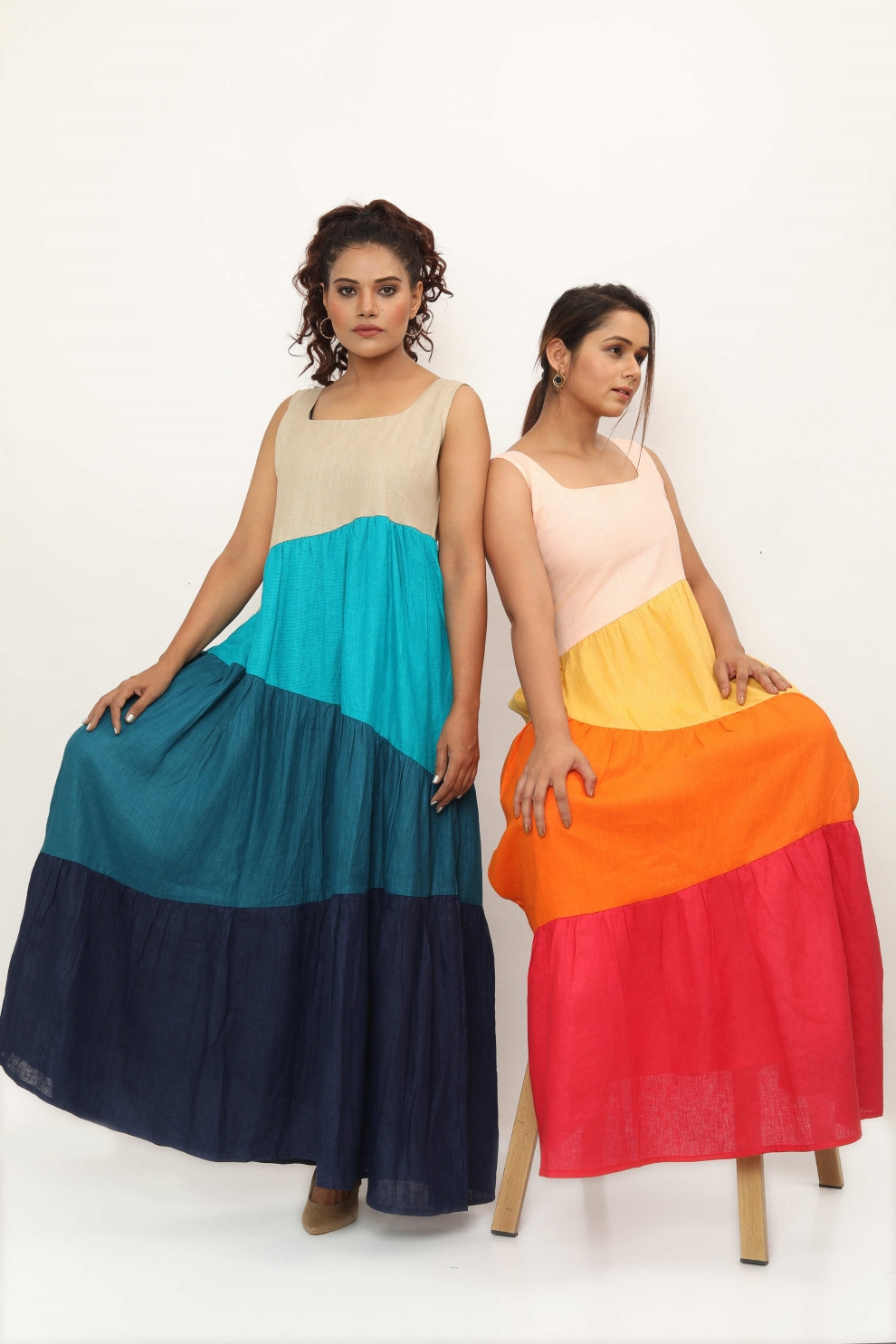Presenting the Brea Dress, a modern embodiment of elegance and vibrancy. With its square neck and broad shoulder straps, this maxi dress epitomises sophistication and timeless style. Boasting diagonally cut tiers, adorned with gathers for texture and movement, each tier showcases a different colour, creating a captivating visual contrast. Elevate your wardrobe with the Brea Dress – a stunning statement of boldness and beauty.