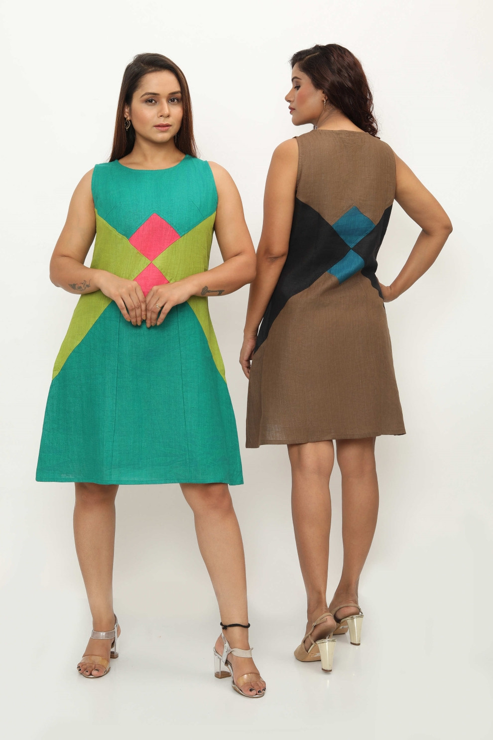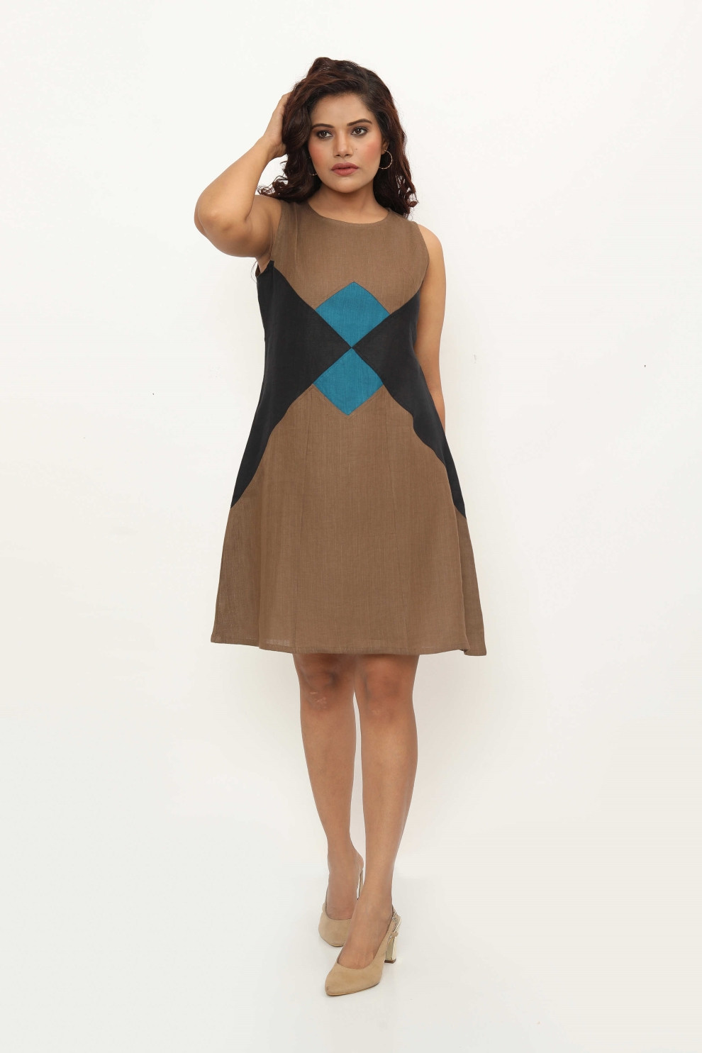 Elevate your wardrobe with the Catalina Dress, a knee-length marvel that exudes elegance and charm. Crafted with meticulous attention to detail, this dress features a refined round neck and tailored waist, ensuring a flattering fit for every occasion. What sets it apart? Striking colour-blocked patches in triangular and diamond motifs adorning the waist, ensuring you stand out with every step. Experience luxurious comfort and timeless sophistication with the Catalina Dress, where style meets individuality.