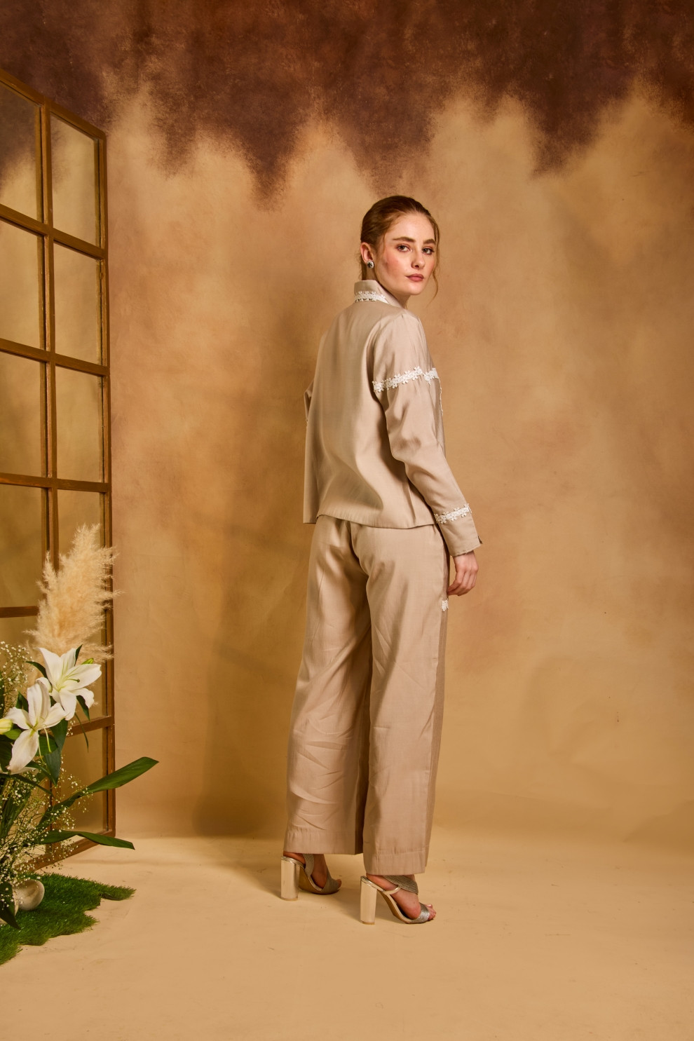 A monotone co-ord set adorned with all-over lace appliqué detailing, designed as a smart and comfortable wardrobe essential.
