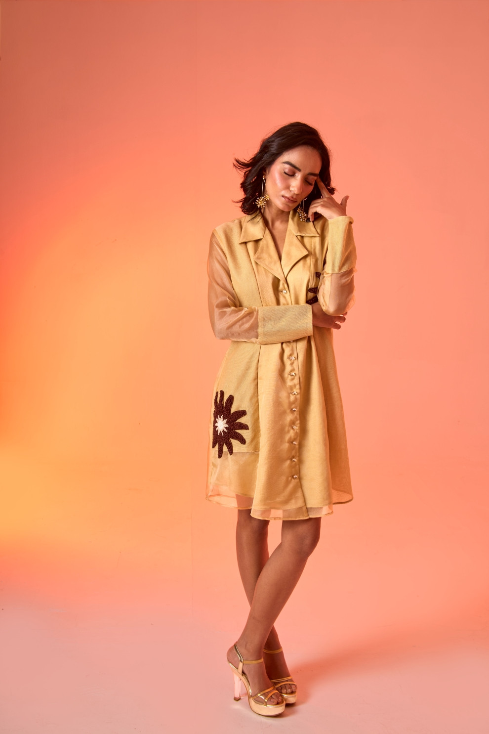 The Daybreak dress is a stunning fusion of ethereal charm and intricate craftsmanship. This knee-length organza and mesh cut-and-sew creation features a statement hand-embroidered patchwork detail, making it a perfect balance of delicate elegance and bold artistry.