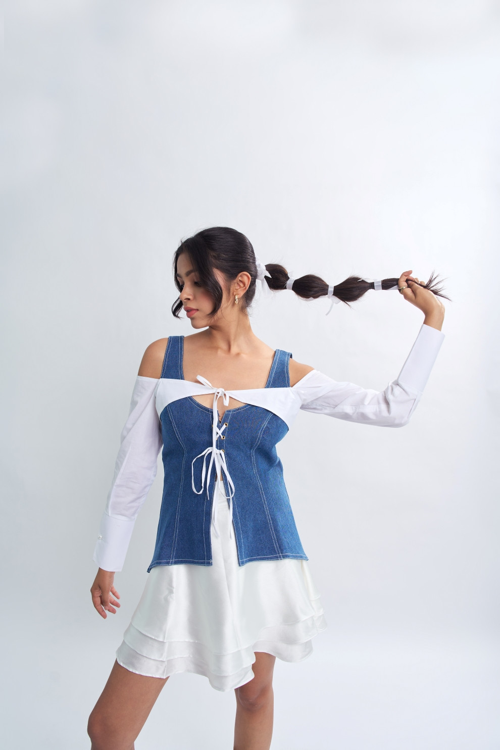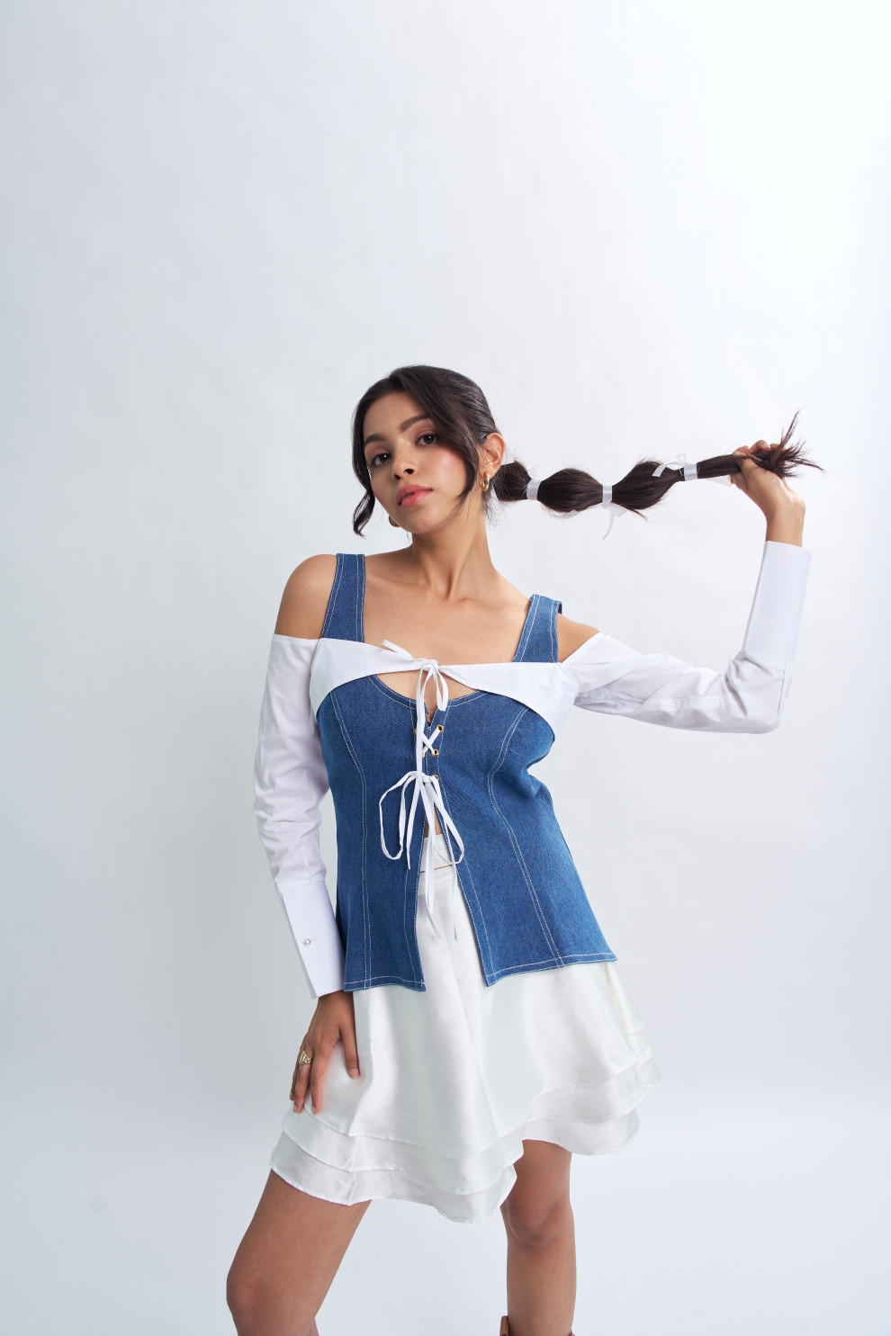 This tailored denim top combines classic charm with contemporary flair. With a tie-front detail adding a touch of whimsy, it offers a flattering silhouette.