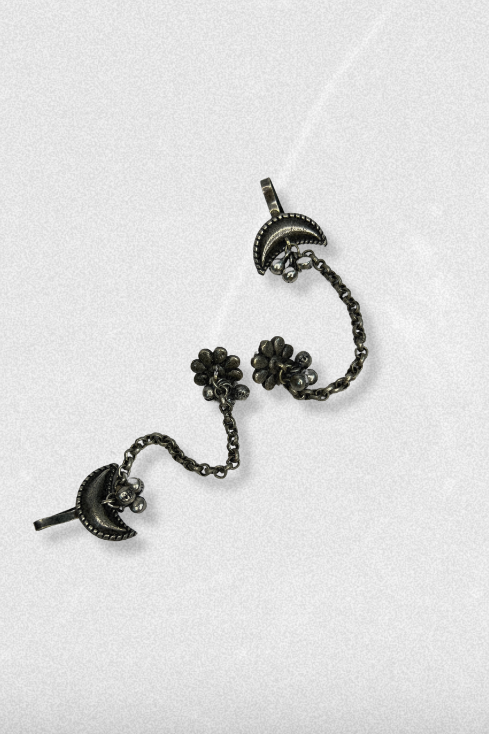 Featuring a delicate floral stud at the lobe and an arched crescent ear cuff up top, the design is brought together by a sleek chain drape, accented with miniature ghungroo charms for a subtle jingle. The oxidized silver finish lends an artisanal, antique edge—making them the perfect fusion of boho elegance and urban glam. Style tip: Sweep your hair into a messy bun or slicked-back ponytail to let the full silhouette shine—pair with layered silver rings for a bold, cohesive look. Size : Length 5 inch Weight : 22 gram Material : Brass