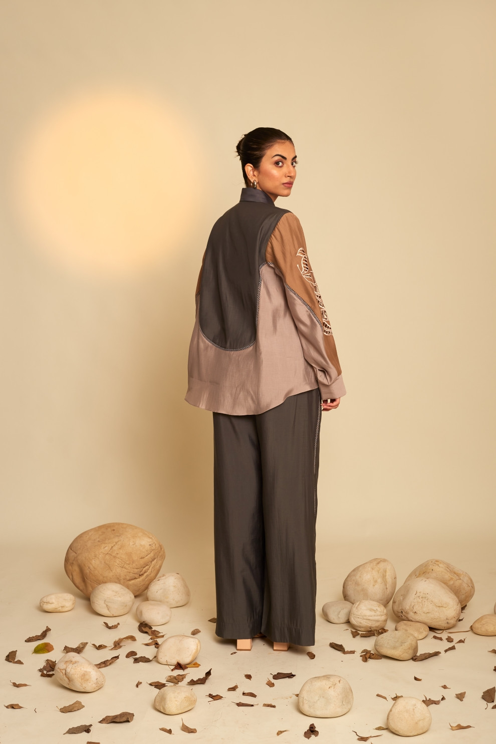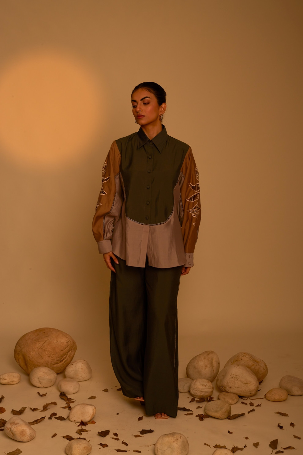 Elora co-ord set showcases a tricolor cut and sew shirt with cutwork sleeves.The ensemble is completed with matching pants that feature a side color block and connecting lace elements, imparting a contemporary flair to the overall look.