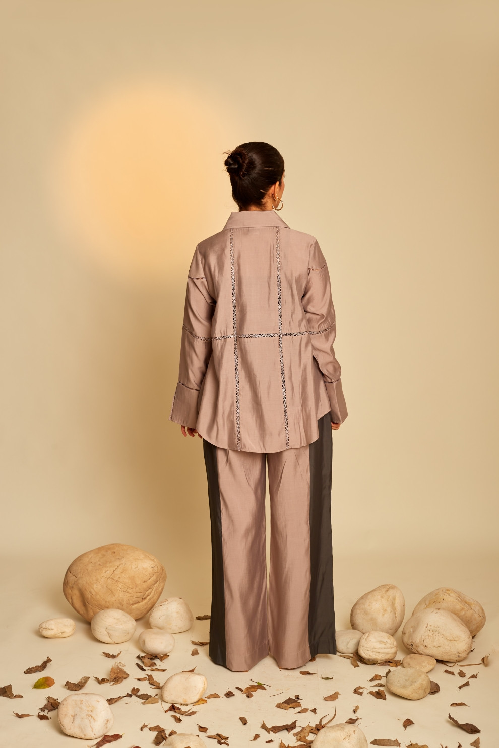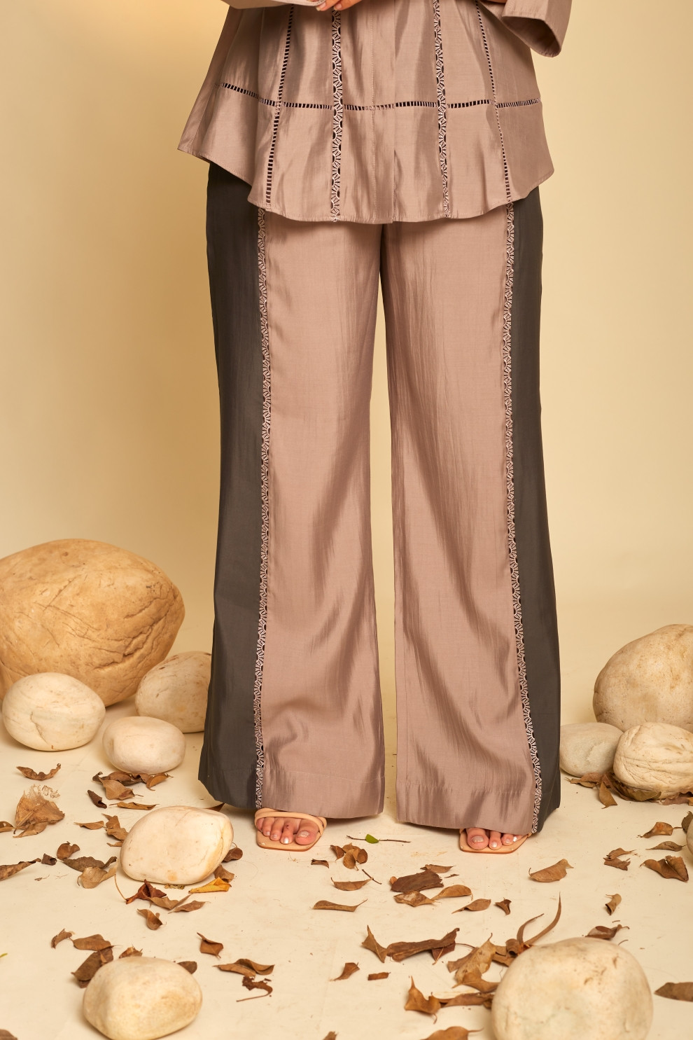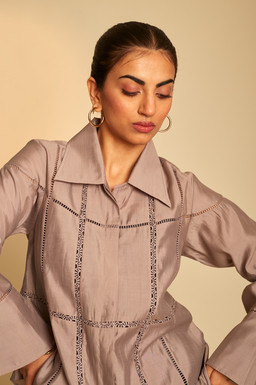 The Enigma shirt is distinguished by its elaborate intersecting lace inserts, which contribute to a highly sophisticated and intricate design. The shirt comes with a contrast slip inside, is paired with a lace insert color block straight pants.
