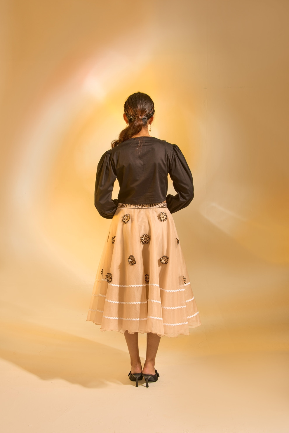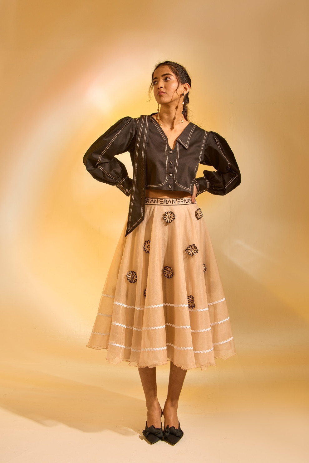 This shirt and skirt set is a beautiful fusion of clean lines and delicate details. A solid cropped shirt with an extended collar offers modern style, while the organza skirt with 3D applique flowers creates a soft, textured contrast, elevating the entire ensemble to new heights of feminiity.