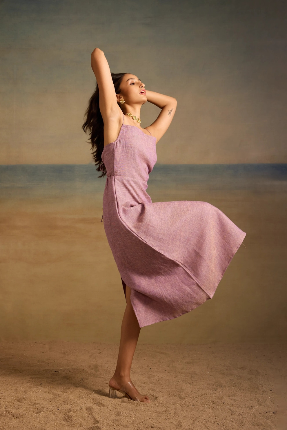 A breezy midi crafted for warm days and coastal escapes. The Esme Dress features a structured square neckline and slender shoulder straps, falling into a flattering A-line silhouette. The standout detail lies at the back — a delicate lace-up design adorned with hand-threaded bead accents that add a playful, artisanal finish. Wear it to brunches, beach strolls, or golden hour soirées — this piece moves beautifully with you.