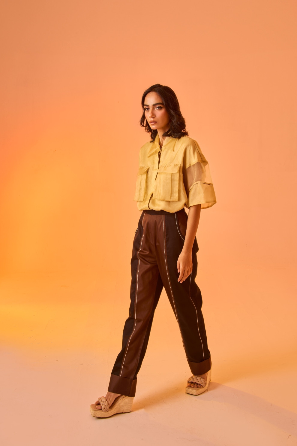 Breezy yet bold—an oversized organza shirt with eye-catching statement pockets, paired with dual-shade balloon-fit pants for an effortlessly stylish ensemble.