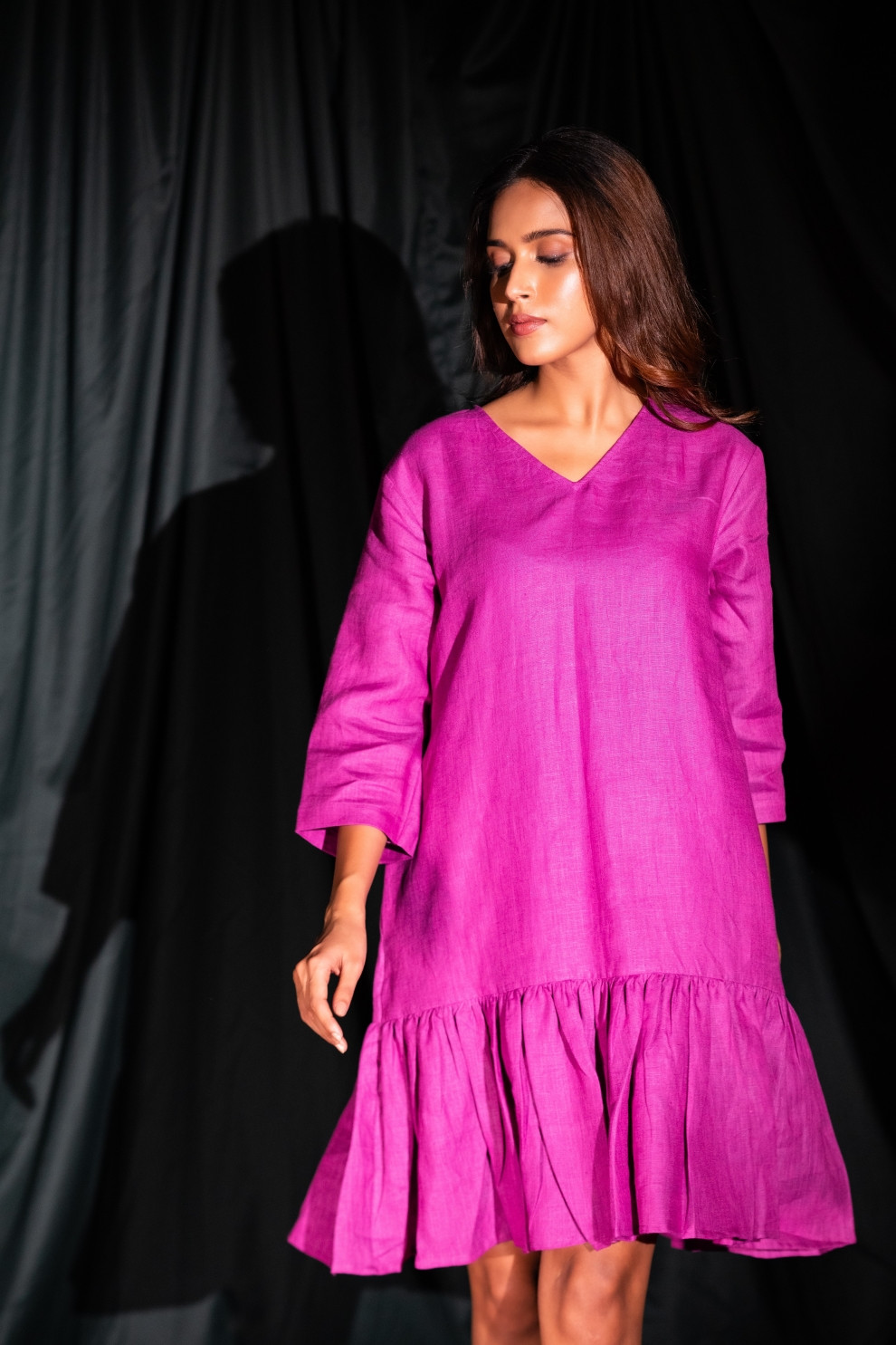 This easy, versatile Fleur Dress is designed to offer an effortlessly chic look for every day. With its relaxed silhouette, flattering V-neckline, and 3/4 sleeves, it strikes the perfect balance between comfort and understated elegance. The ruffled hem adds a subtle touch of playfulness to the design, making it an ideal choice for everything from casual outings to more dressed-up occasions. Pair it with flats or heels to create your own unique style statement, no matter the season.
