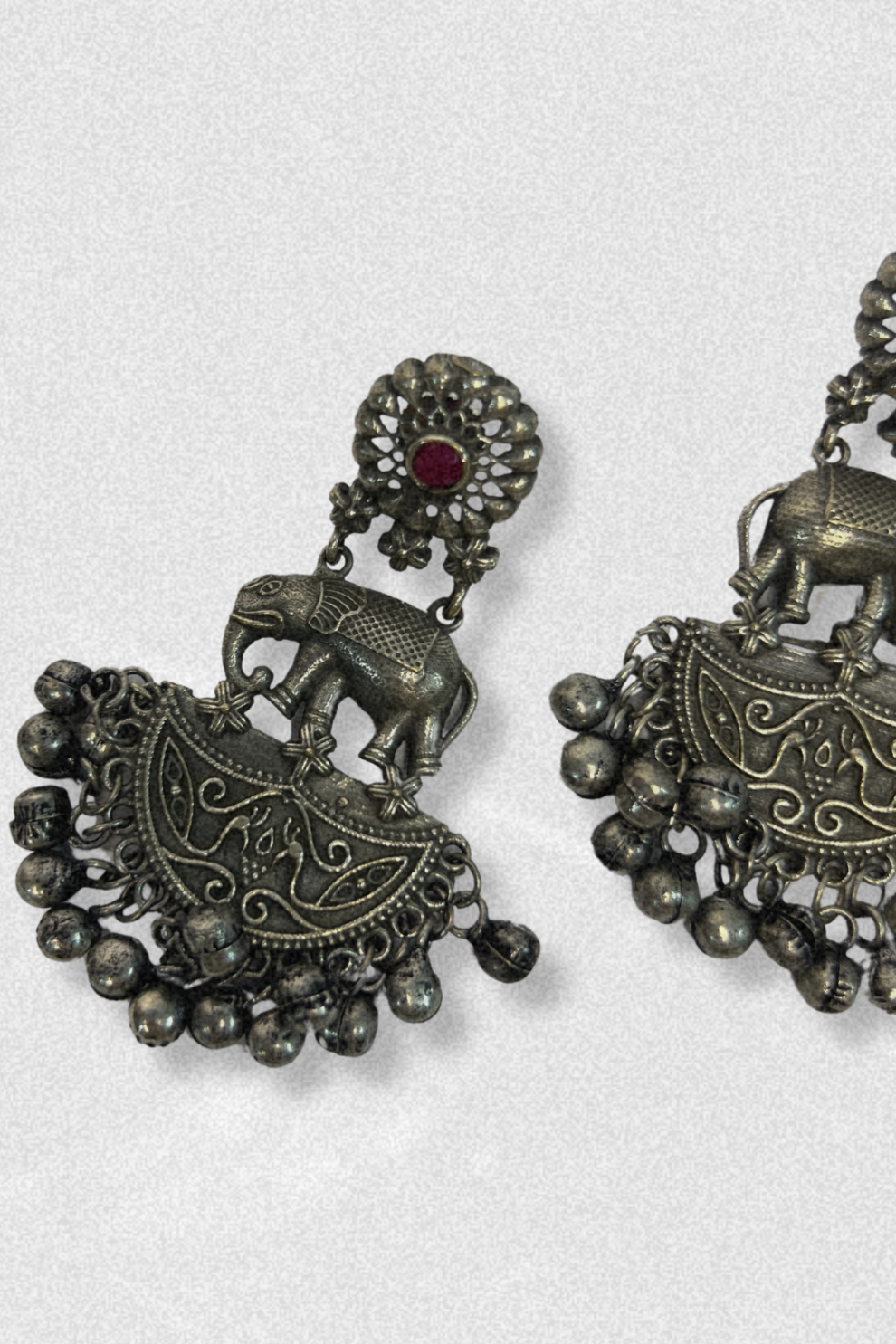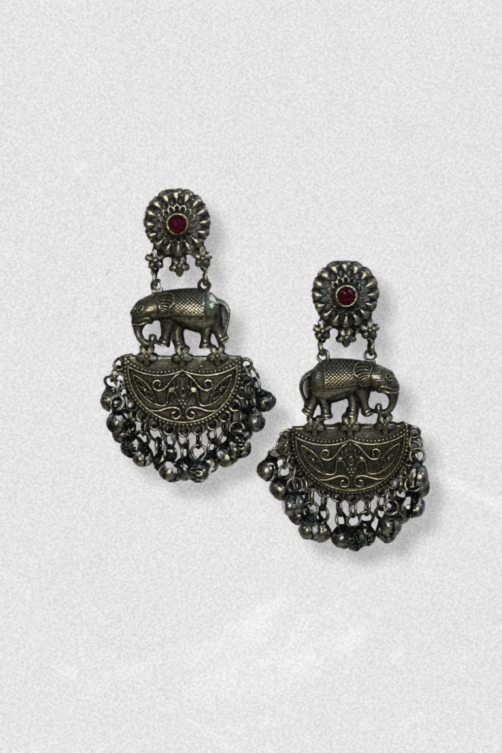 A majestic tribute to heritage and power, these earrings showcase intricately carved elephant motifs perched atop ornate crescent design and delicate ghunghroos that add subtle and charm. The deep red stone accents enhance their vintage appeal, making them a perfect pick for festive gatherings or statement everyday wear. Let tradition jingle softly with every turn of your head. Size : Length 6.5 cm Weight : 29 gram Material : Brass