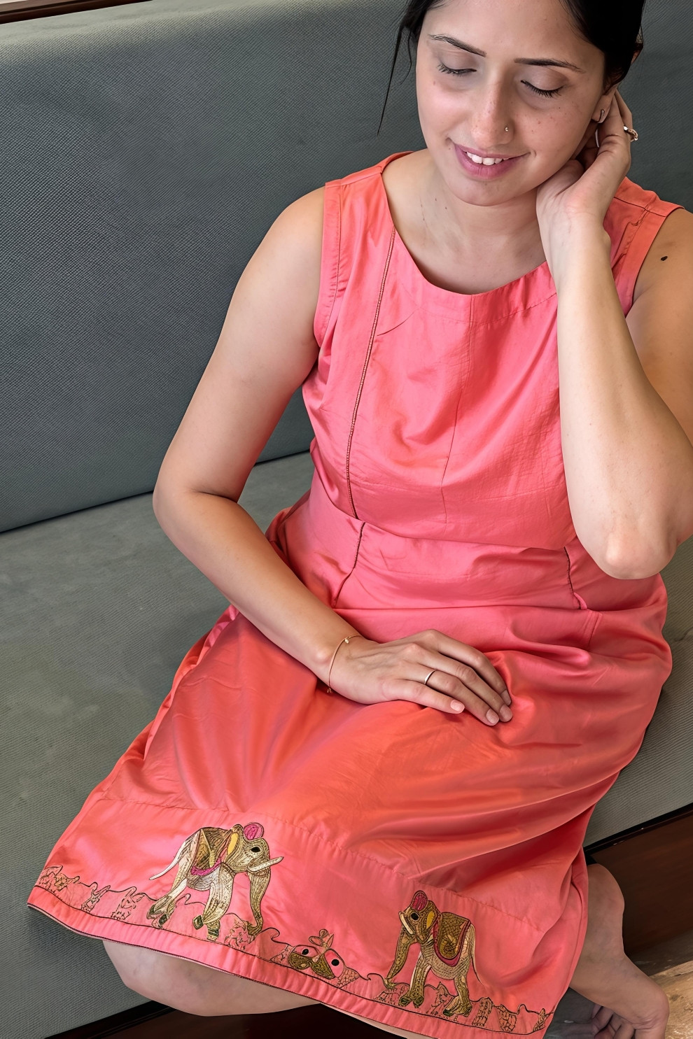 Sleeveless, A-line silhouette with piping to give it flare below waist
