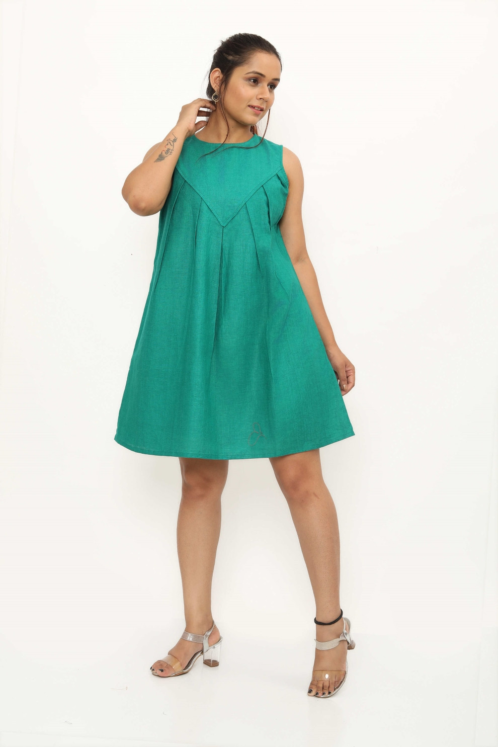 Introducing the Granada Dress - a sleeveless midi dress designed to captivate with its flattering pleats cascading from the yoke. These pleats not only add flare but also allow the dress to move and dance with grace, ensuring a dynamic and elegant presence for whoever wears it. Perfect for a brunch outing, pair it with strappy sandals and a woven sun hat for a chic and effortless daytime look. Complete the ensemble with delicate jewellery and a crossbody bag for added sophistication.