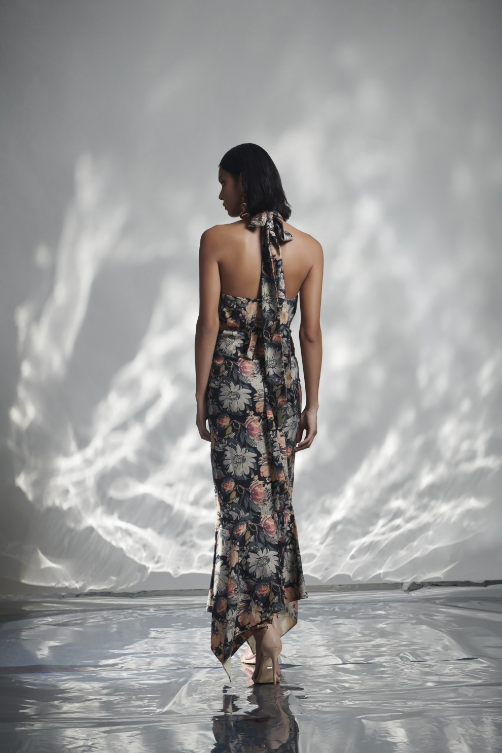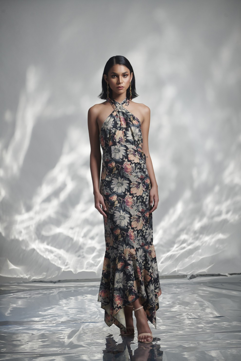 Crafted from a lightweight pashmina, this brunch dress envelops you in a gentle embrace of comfort and style. The delicate black and multicolour floral print evokes the timeless beauty of nature, making it a delightful choice for any occasion.