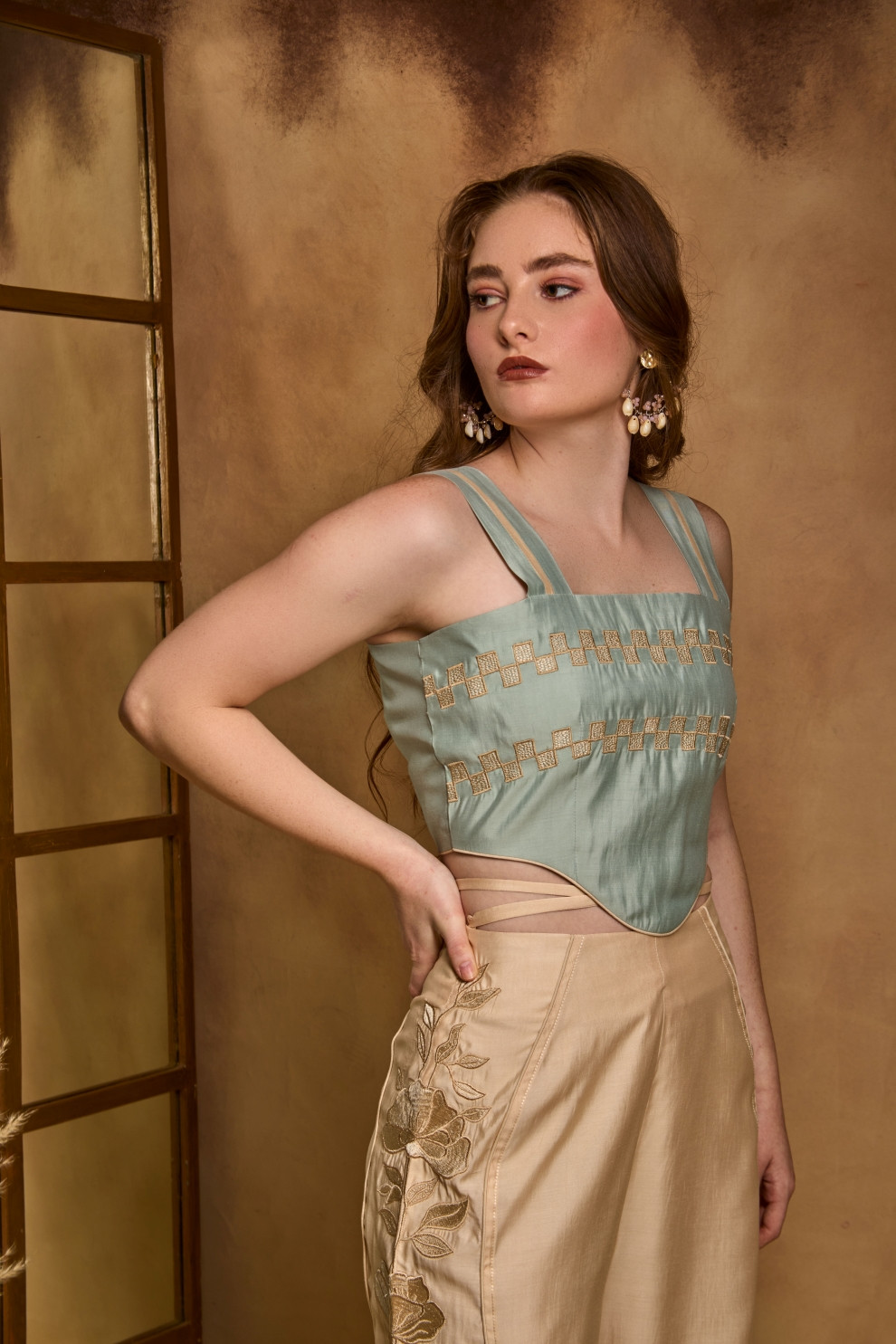 A subtle expression of florals, featuring tonally embroidered statement trousers paired with an asymmetric crop top adorned with geometric embroidery patterns. The pants include a loop-tie waist adjustment for a custom fit.
