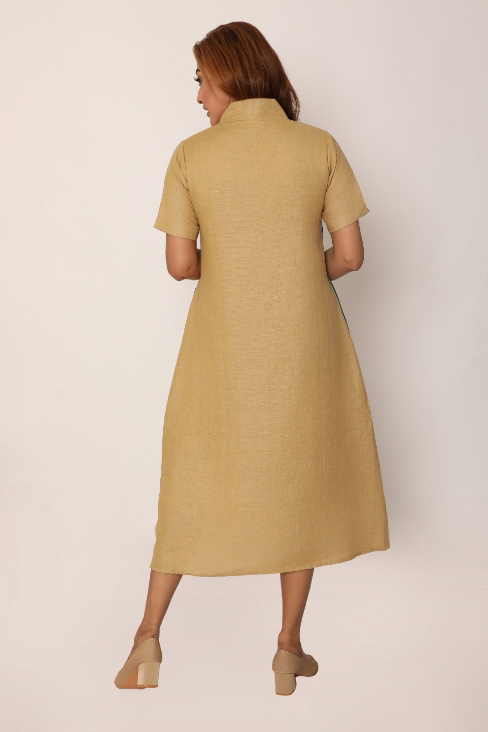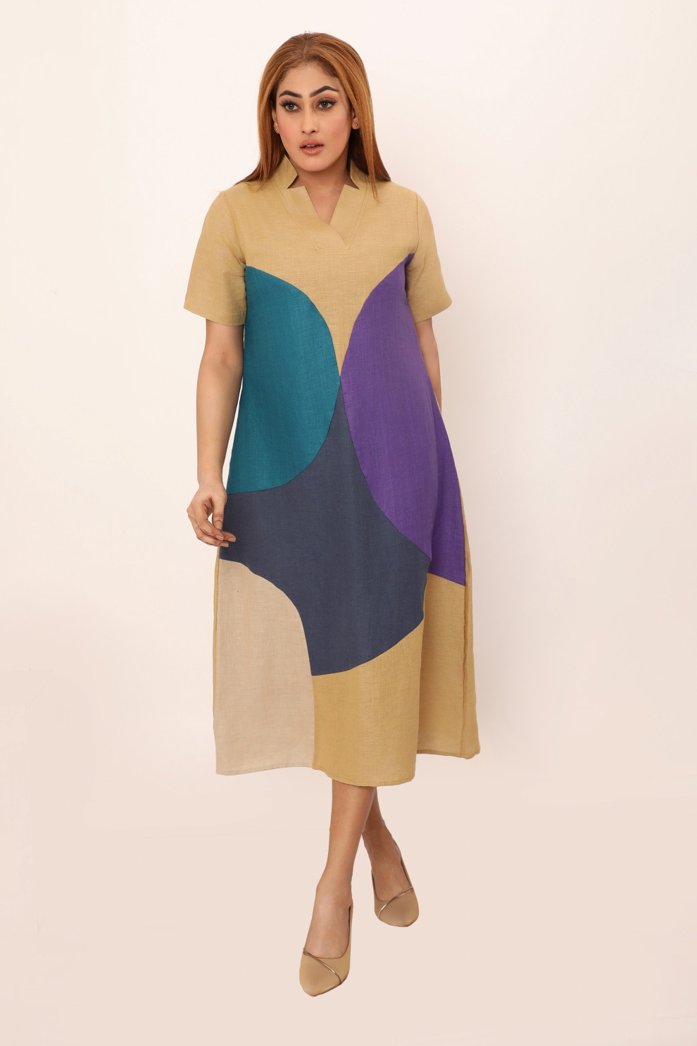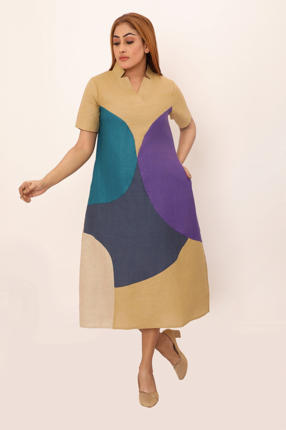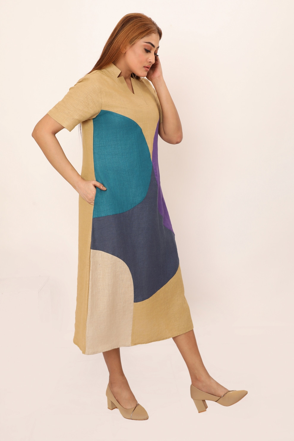 The Ivy dress is a beautiful fusion of bold colour-blocking and a sleek silhouette. This midi dress features a striking abstract pattern and a tailored fit that flatters the figure while allowing ease of movement. The notched neckline and short sleeves add structure, making it a versatile choice for any occasion. Crafted from breathable fabric, this dress is perfect for transitioning from day to night with effortless style.