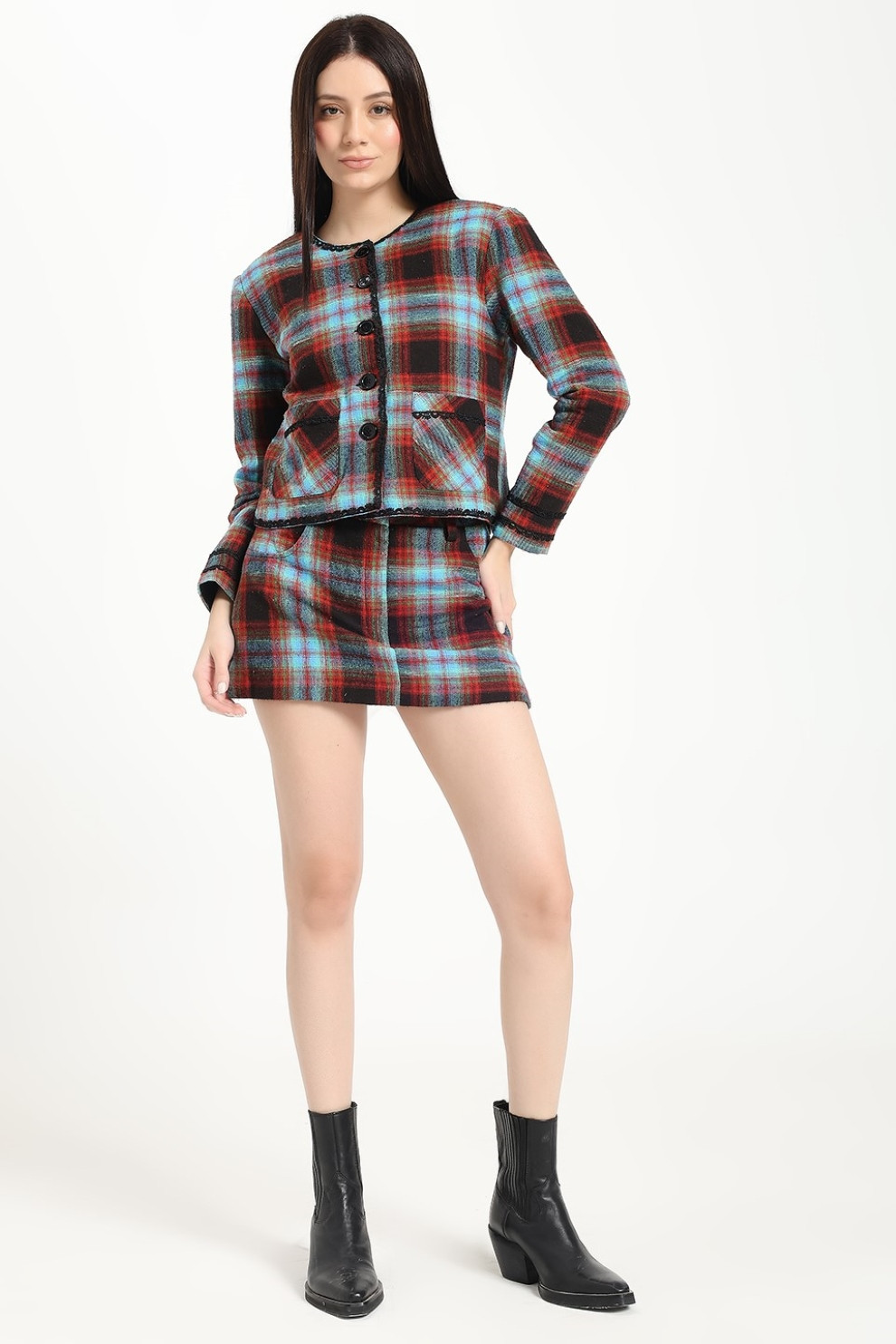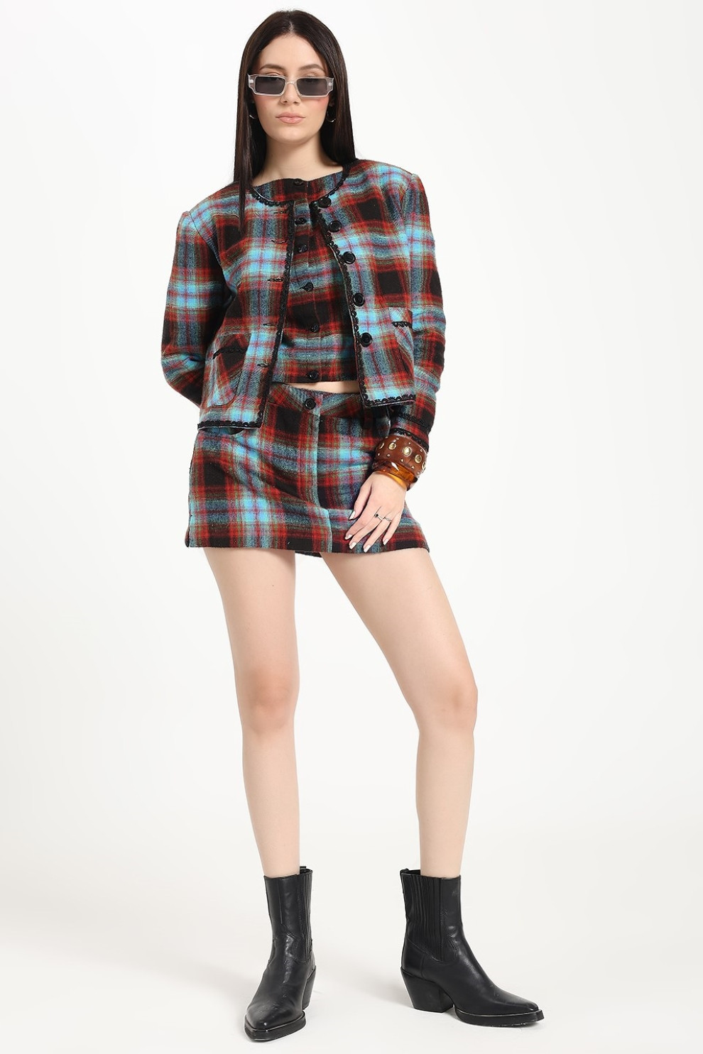 An elegant fusion of sophistication and edge, this blazer redefines timeless style. Tailored in a boxy silhouette, it exudes effortless cool while maintaining a structured, polished look. The padded shoulders lend a touch of power dressing, perfectly balanced by delicate lace trims along the neckline and sleeves — a subtle feminine contrast to its modern shape.
