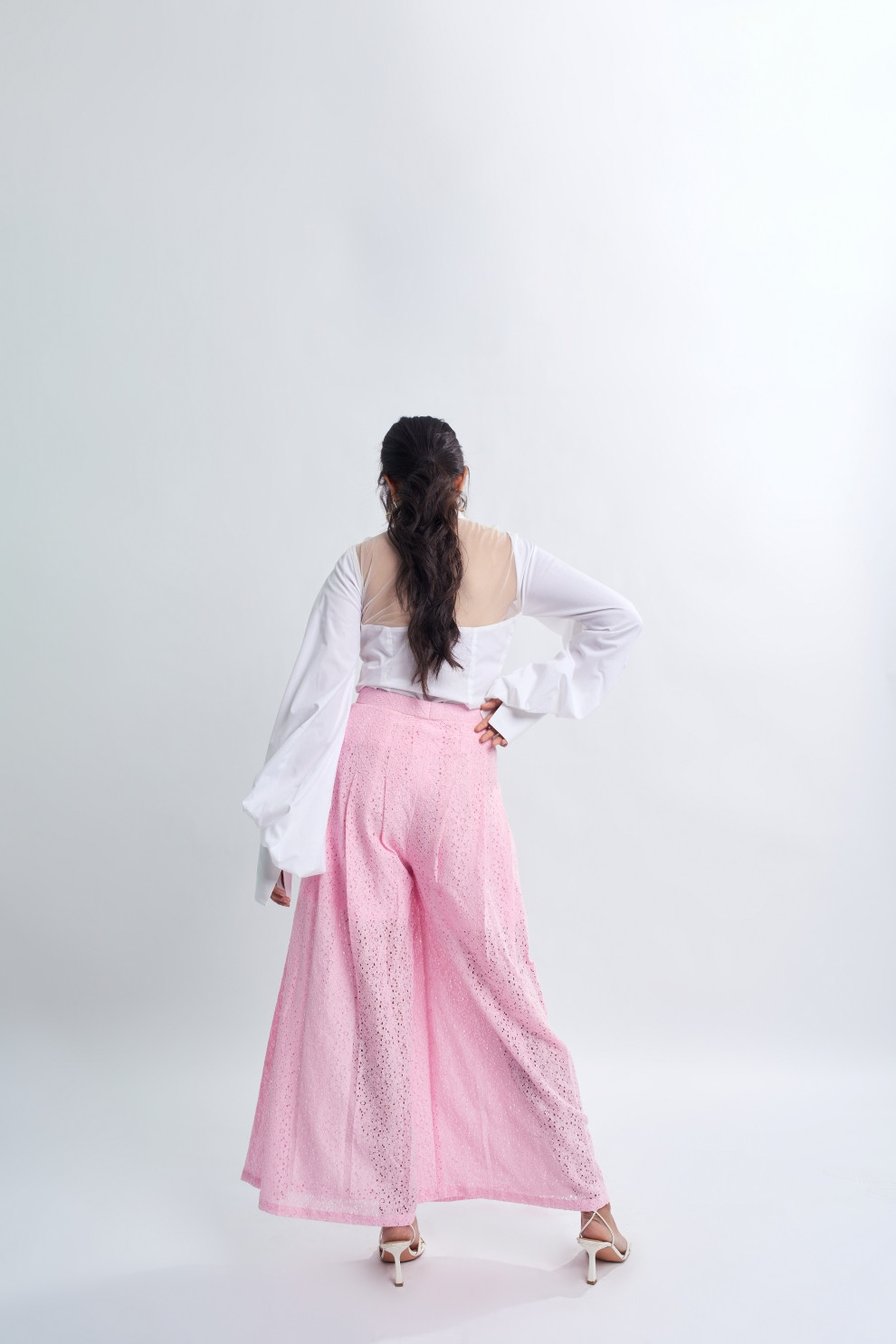 These pink lace trousers for women are both chic and sophisticated. Crafted from delicate lace fabric, they offer a graceful and feminine aesthetic. The trousers feature pleats, adding subtle texture and movement to the design.