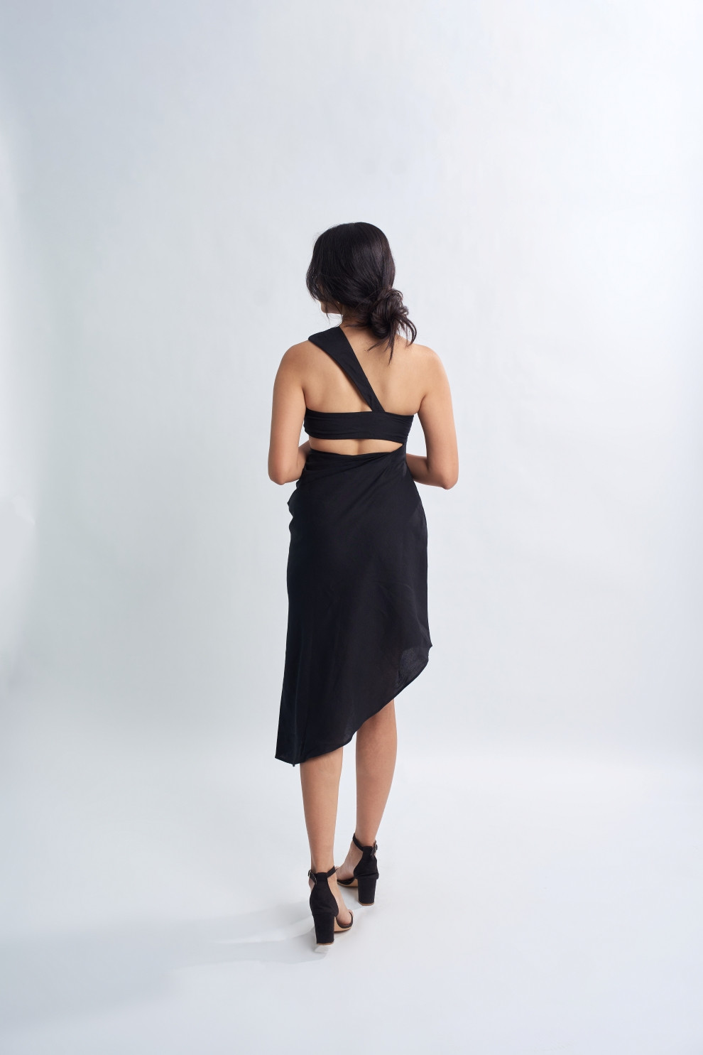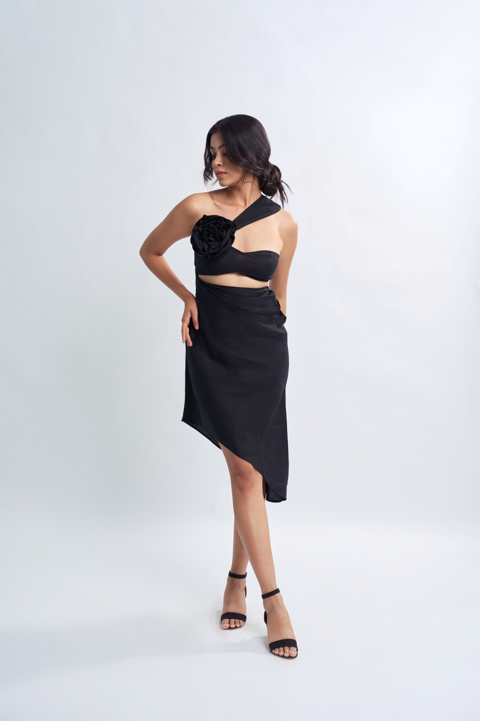 This black cotton and linen blend dress features a charming flower embellishment on the bust, adding a touch of elegance. Its asymmetrical hemline adds a modern flair to the classic silhouette, making it a versatile and stylish choice for any occasion