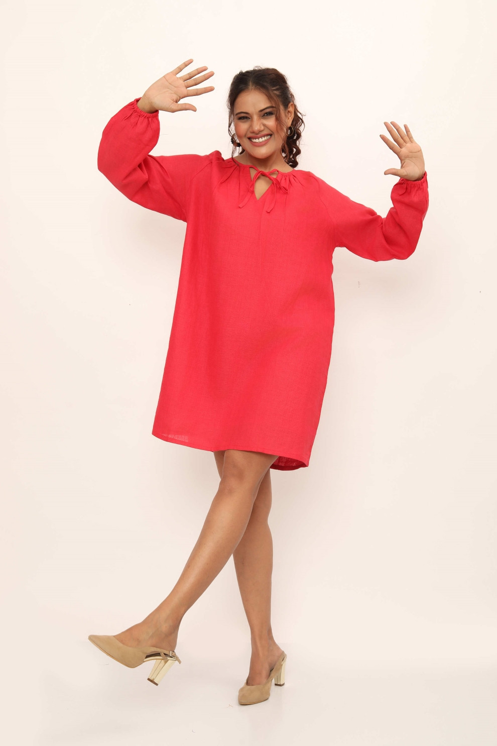 Introducing the Loma Dress - a versatile piece designed for both comfort and style. With gathers around the neckline and a V-cut adorned with strings to tie at the neck, this straight-fit dress offers a relaxed fit, perfect for lounging all day. Complete with full sleeves featuring elastic around the wrist, it combines effortless elegance with comfort. Crafted from luxurious linen, the fabric adds an extra layer of comfort, perfectly complementing the relaxed design of the dress.