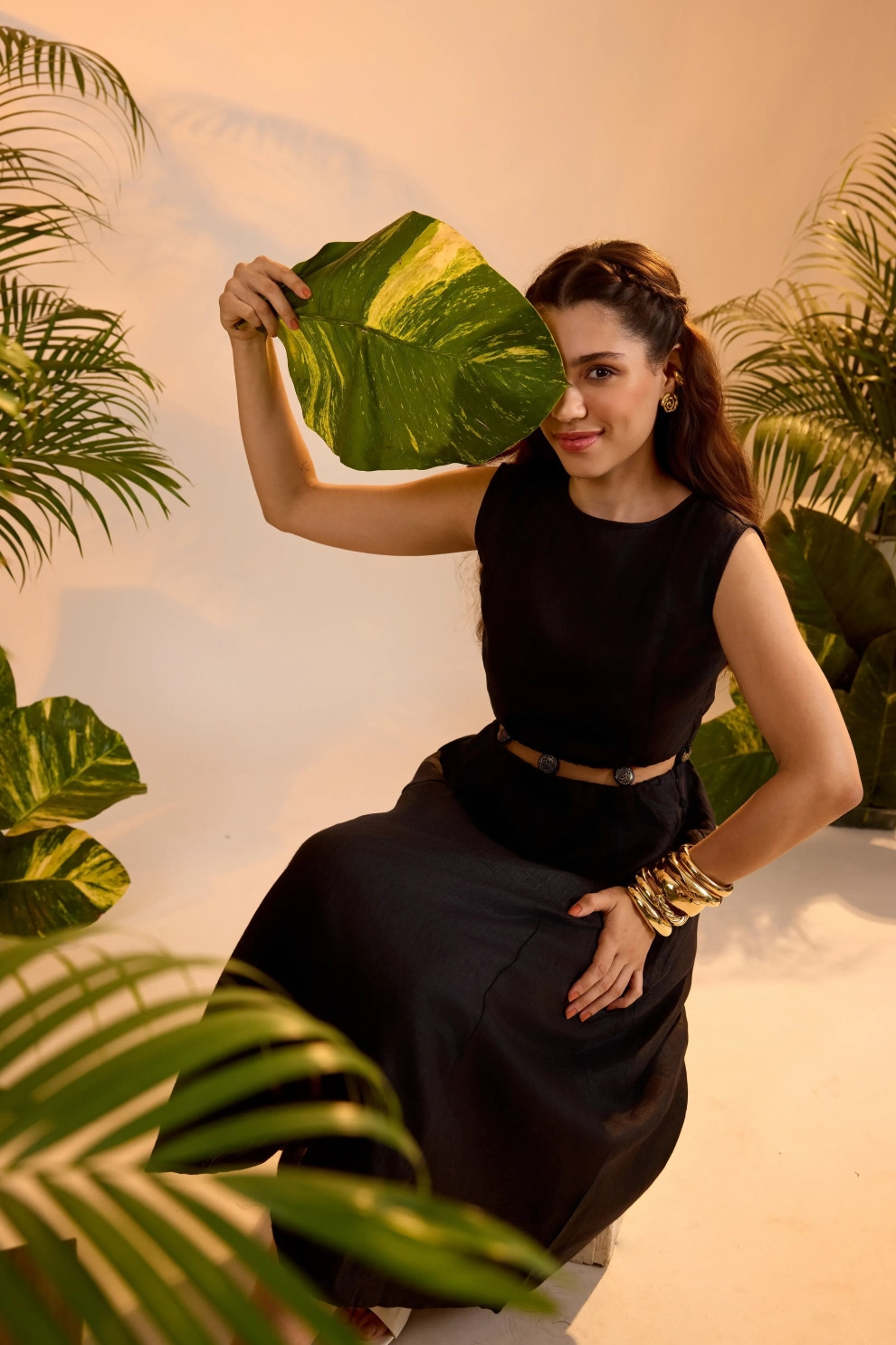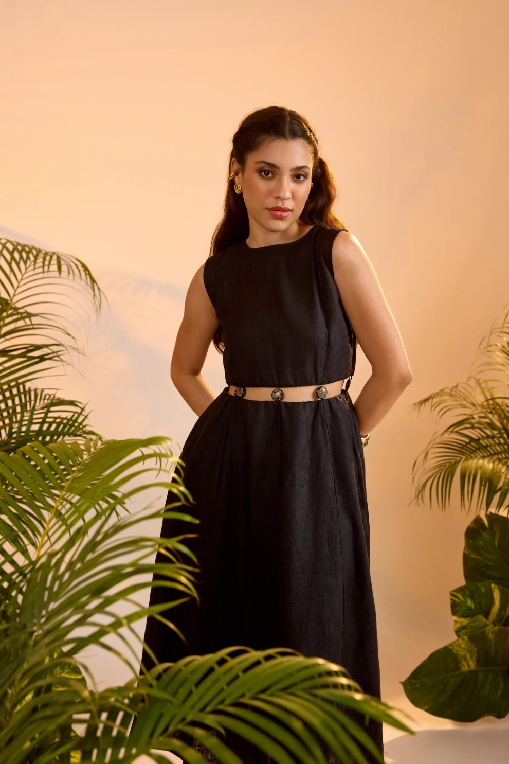 The Lyla Dress blends clean geometry with subtle statement details. Designed with a classic sleeveless bodice and a softly flared skirt, this midi-length silhouette features structured side cut-outs connected by a row of vintage-inspired buttons. The result is both refined and playful — a versatile piece that transitions seamlessly from sunlit brunches to evening gatherings. Crafted in breezy linen, it promises comfort without compromising elegance.