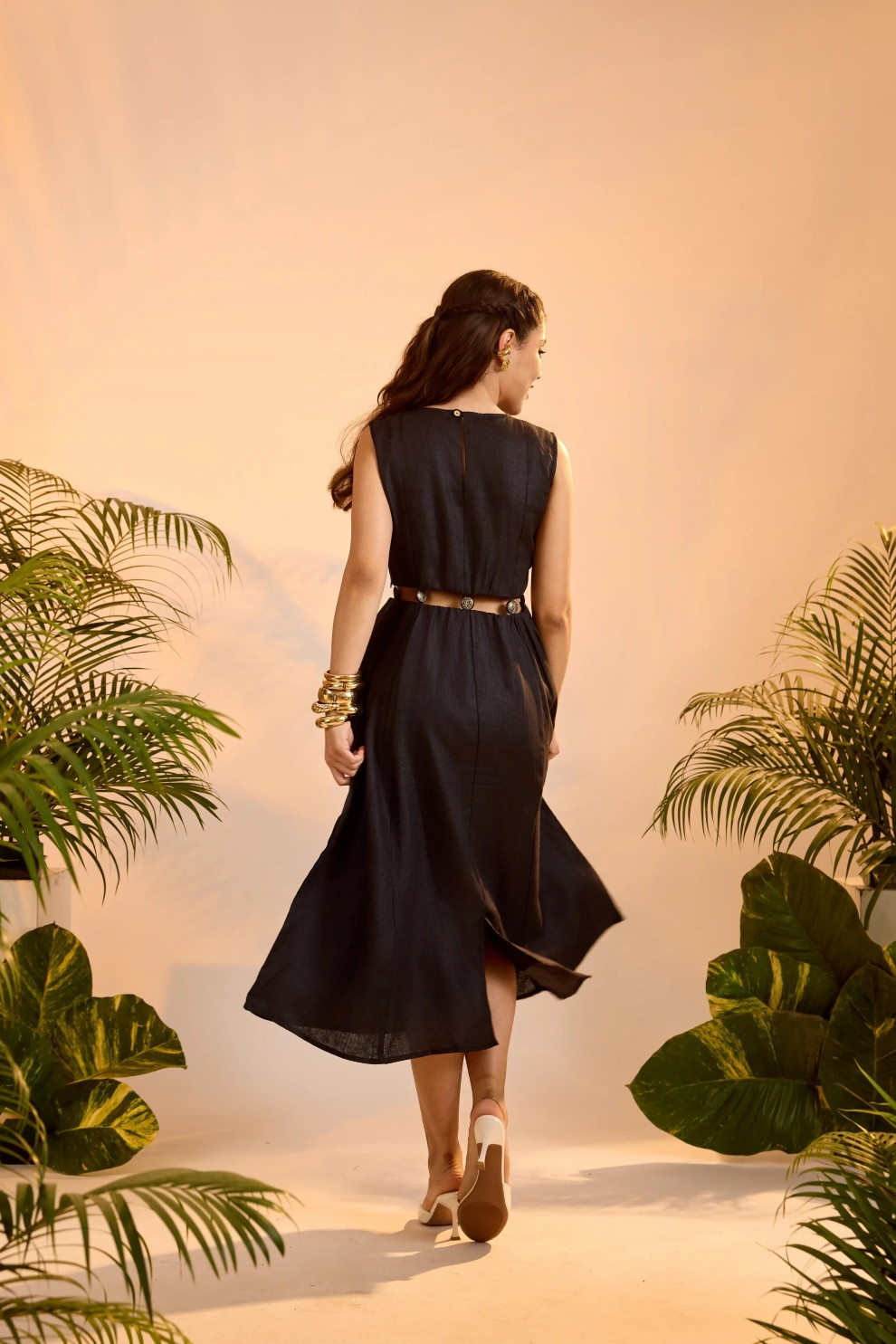 The Lyla Dress blends clean geometry with subtle statement details. Designed with a classic sleeveless bodice and a softly flared skirt, this midi-length silhouette features structured side cut-outs connected by a row of vintage-inspired buttons. The result is both refined and playful — a versatile piece that transitions seamlessly from sunlit brunches to evening gatherings. Crafted in breezy linen, it promises comfort without compromising elegance.