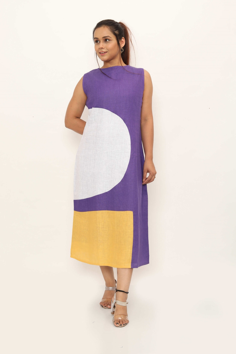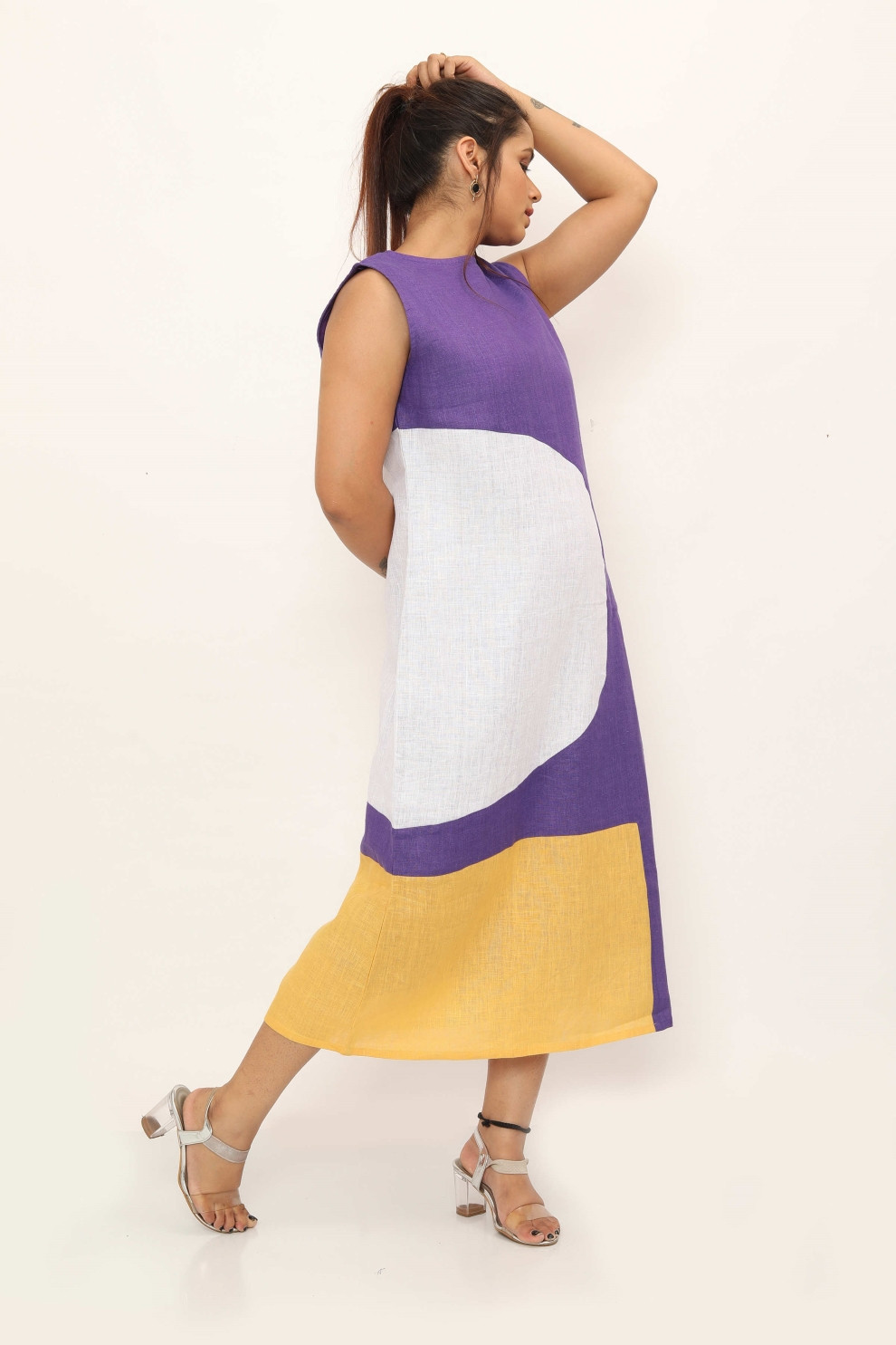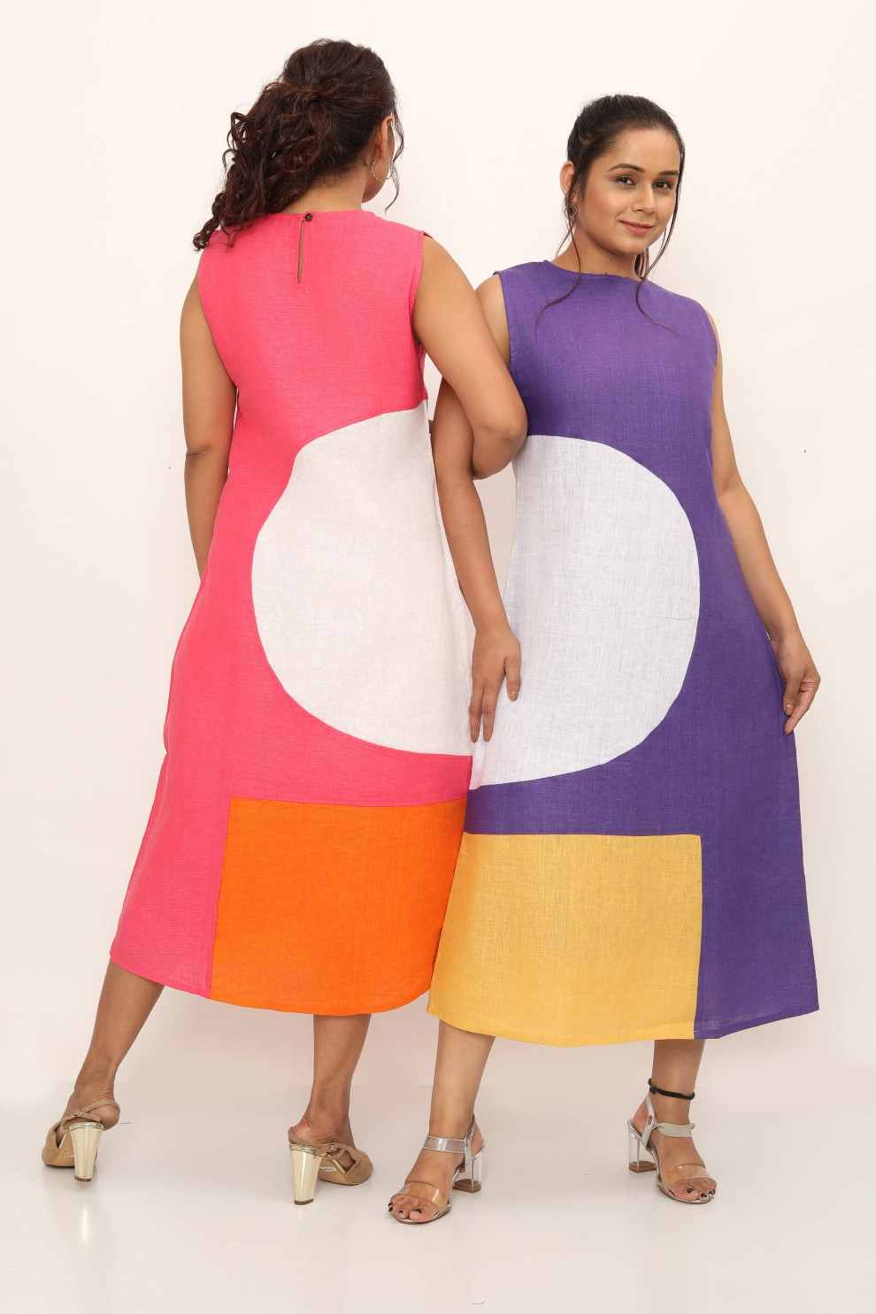 Introducing the Malibu Dress - a figure-enhancing maxi dress designed to elevate your ensemble effortlessly. Featuring a large circular joint on the right side of the waist and a sizable rectangular patch at the bottom right, each patch boasts a unique colour, enhancing its visual appeal. For a laid-back beach look, pair it with woven sandals and a wide-brimmed hat. To transition to an evening affair, accessorise with statement earrings and strappy heels for a touch of glamour.