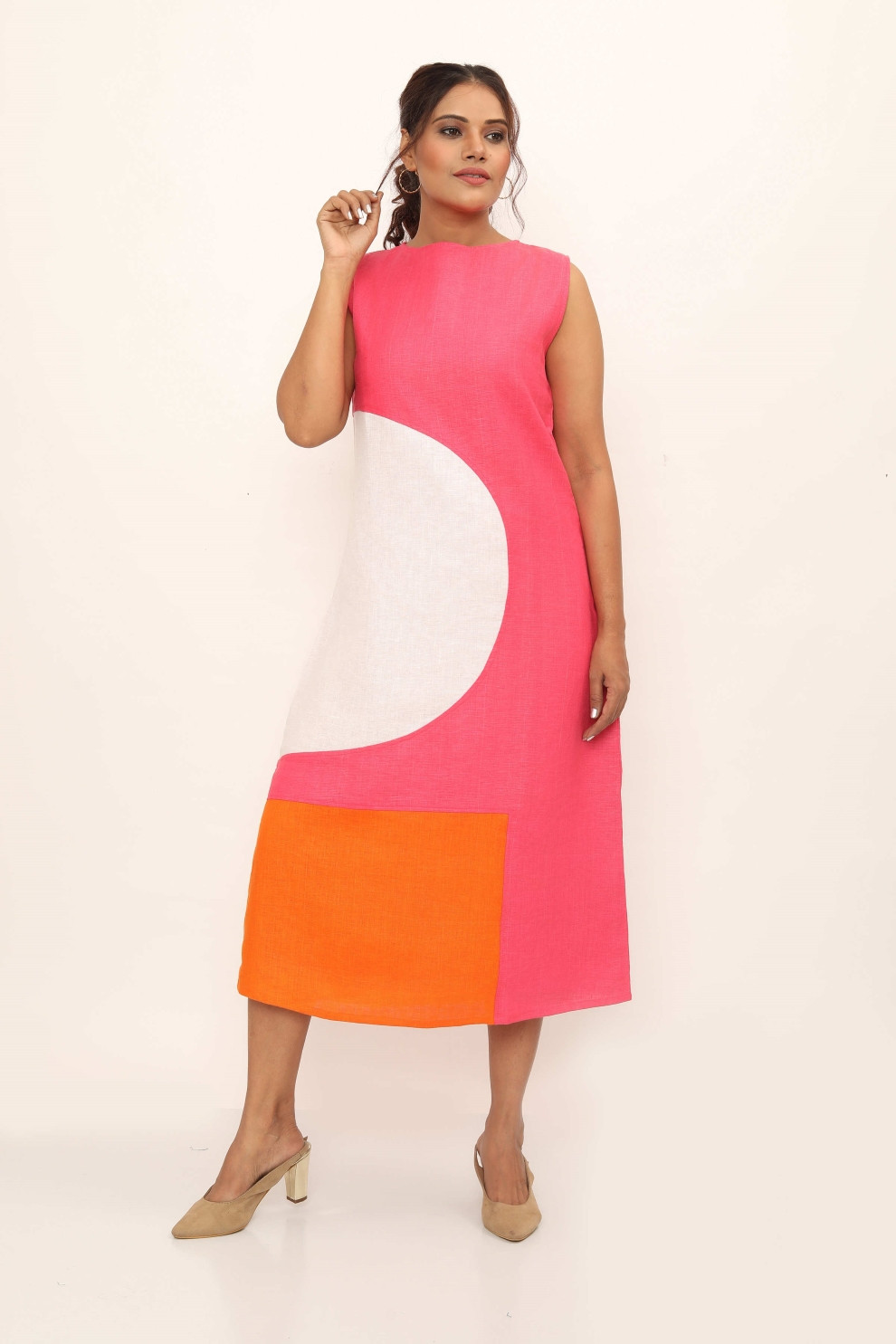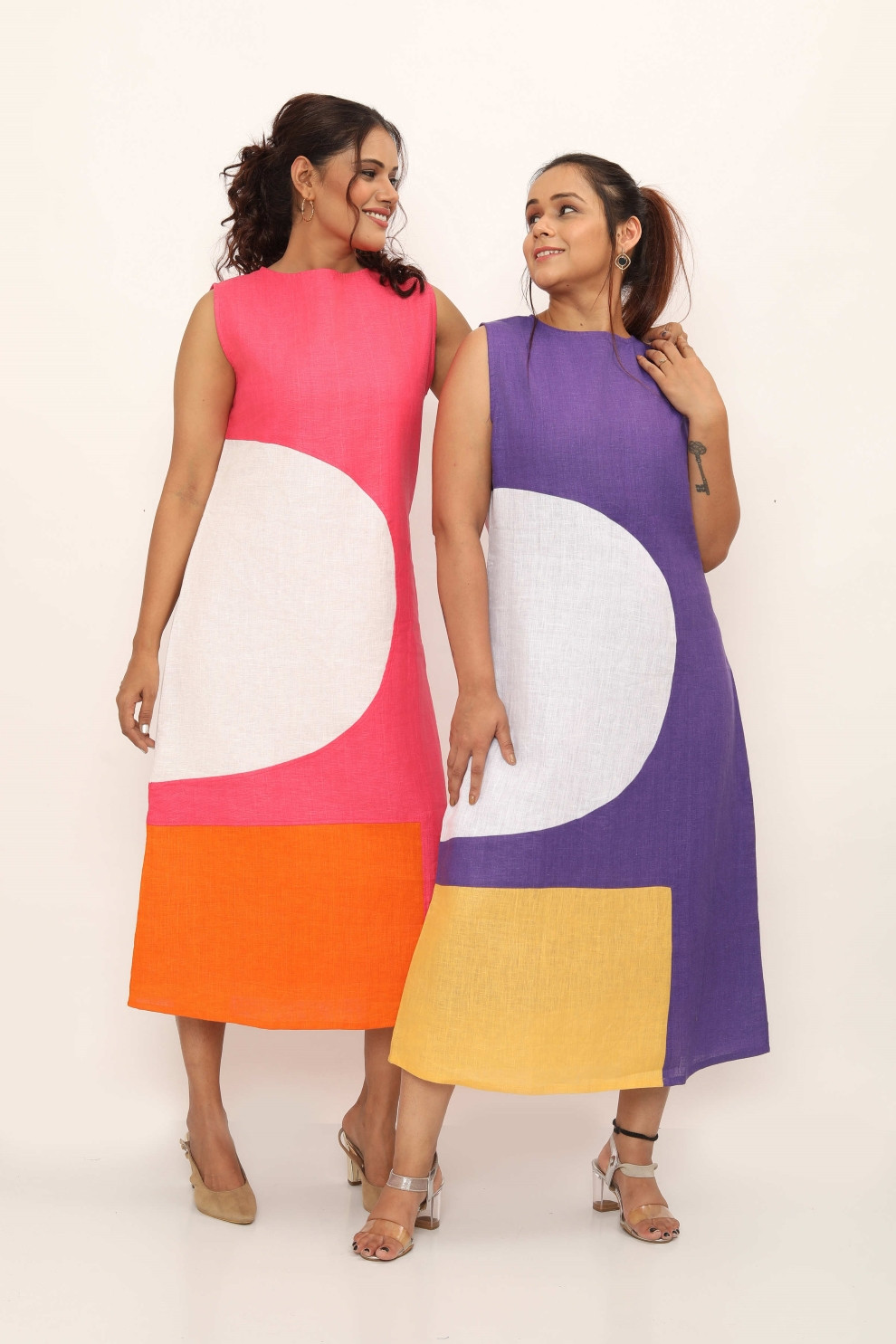 Introducing the Malibu Dress - a figure-enhancing maxi dress designed to elevate your ensemble effortlessly. Featuring a large circular joint on the right side of the waist and a sizable rectangular patch at the bottom right, each patch boasts a unique colour, enhancing its visual appeal. For a laid-back beach look, pair it with woven sandals and a wide-brimmed hat. To transition to an evening affair, accessorise with statement earrings and strappy heels for a touch of glamour.