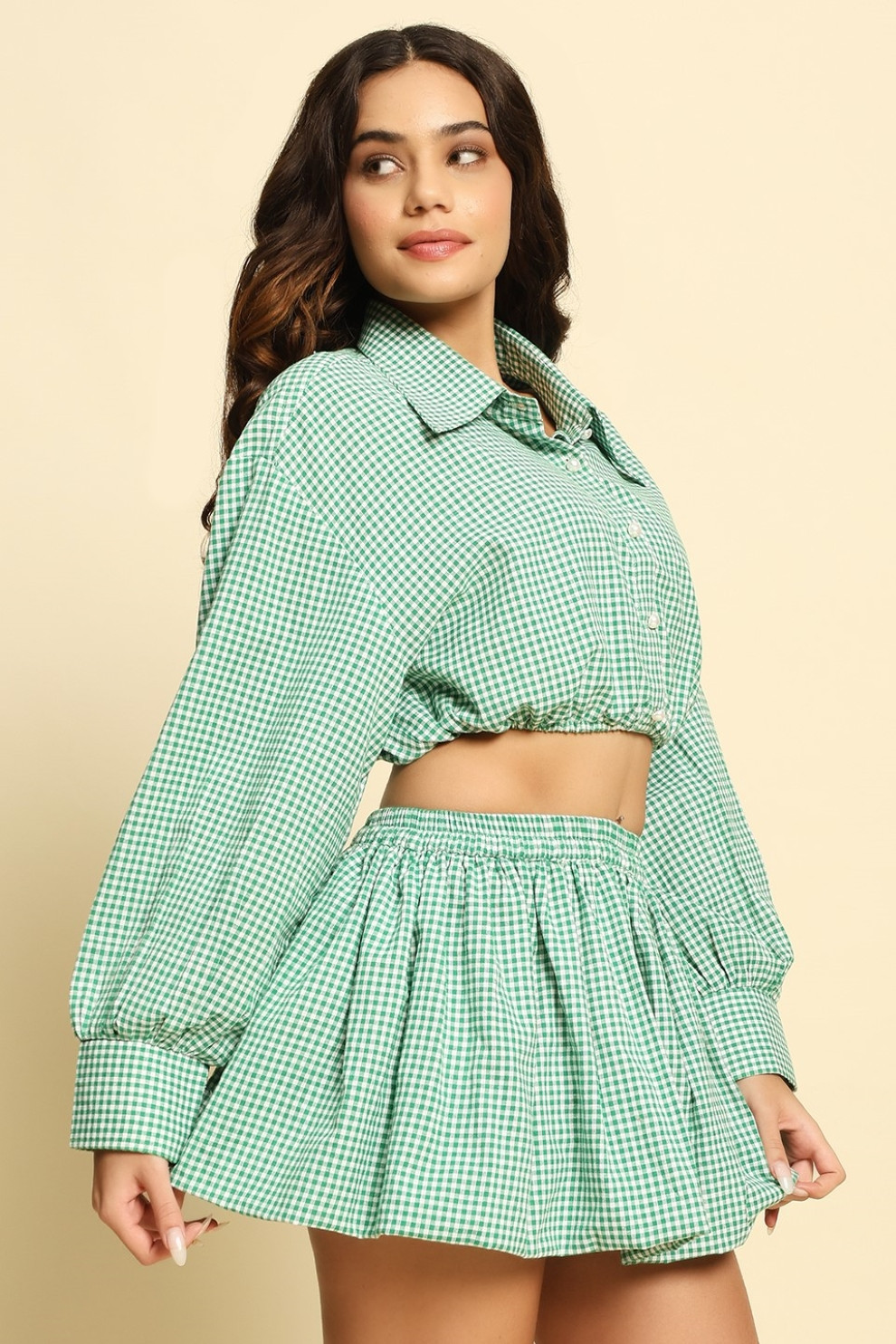 An adorable green and white checkered mini bubble skirt made from 100% cotton. Light, breezy, and perfect for sunny days — pair it with its matching top or your go-to tank for an effortlessly cute look.