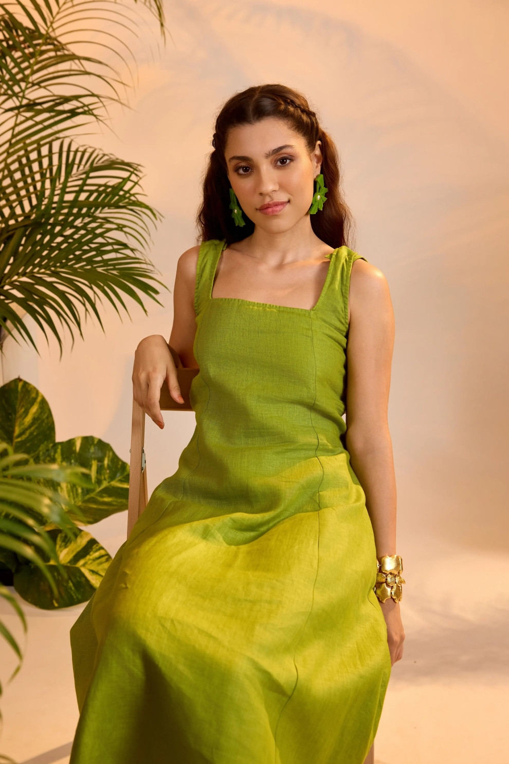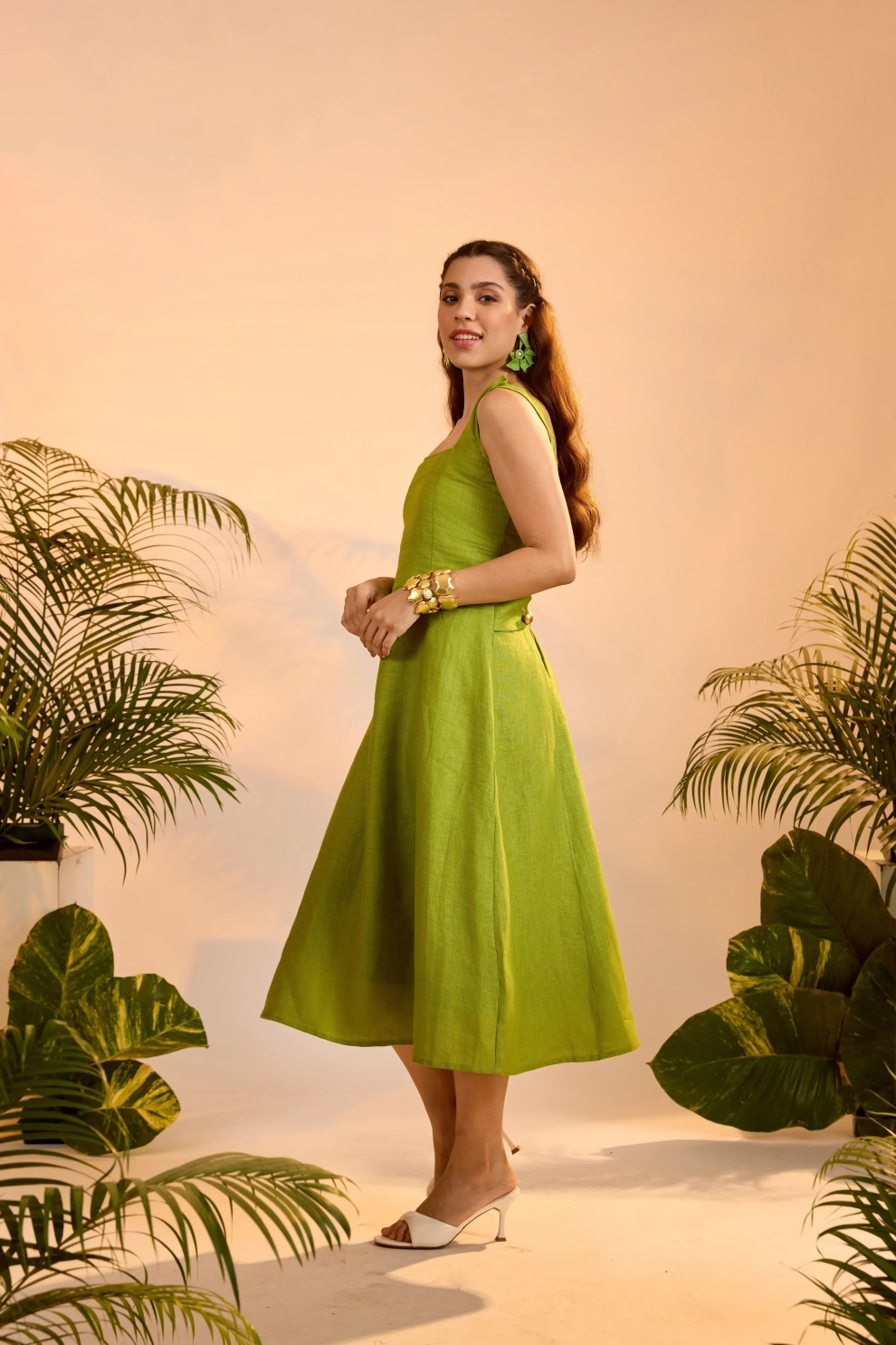 The Mira Dress is a statement in motion. Featuring a squared neckline and a relaxed A-line shape, the highlight lies in its back—elasticated ruched bands punctuated with bold gold-tone buttons. The open-back design offers a daring contrast to the otherwise clean front, making this midi dress perfect for summer soirées or sun-drenched escapes.