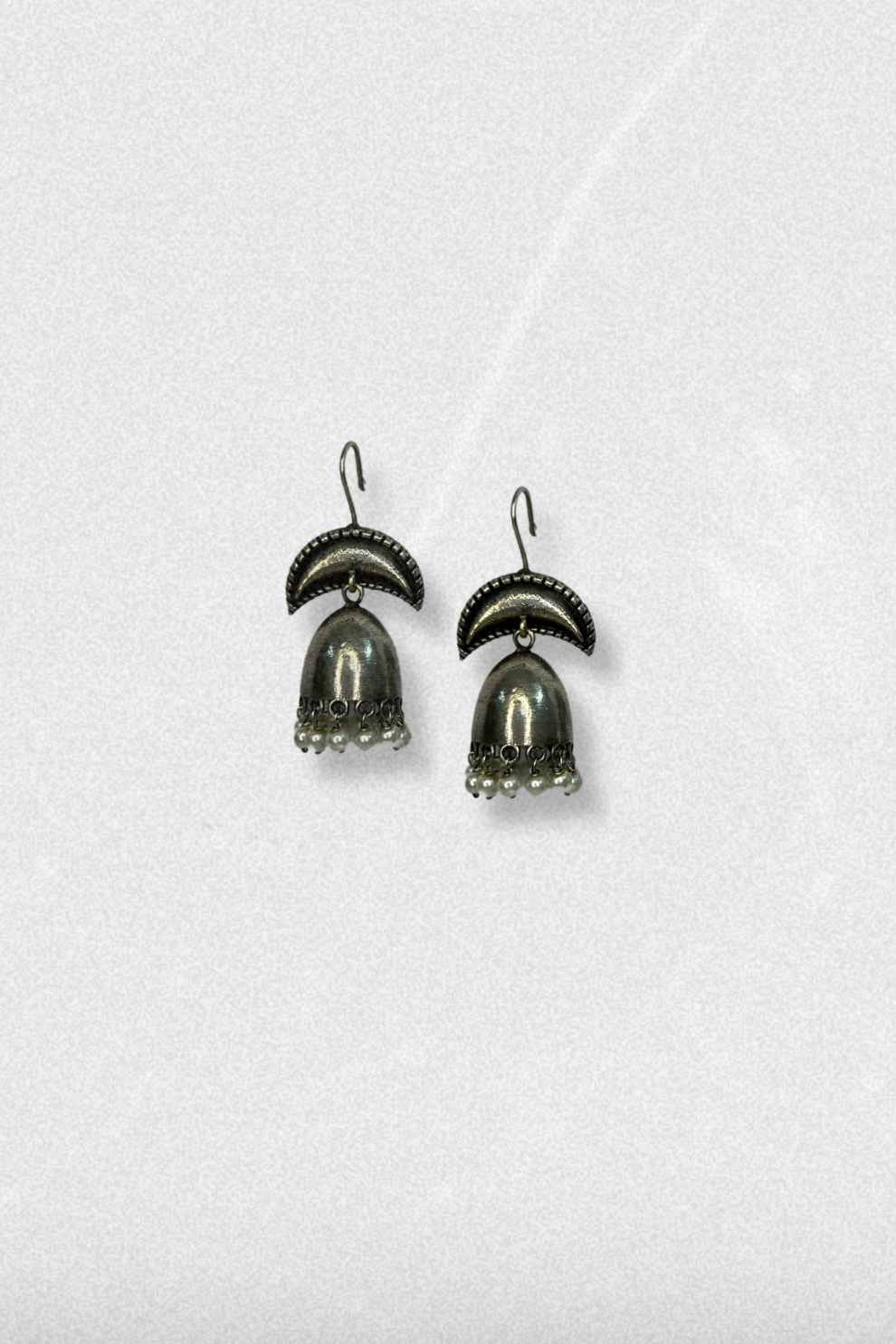 A minimalist reinterpretation of the classic jhumka, these earrings pair a half-moon crescent with a sleek, domed bell drop. The subtle oxidized sheen and delicate drops add quiet elegance, making them the perfect day-to-night transition piece. Style tip: Wear them with a monochrome co-ord set or a linen sari for a cool-girl edge. Add soft waves and a nude lip for a refined, contemporary finish. Size : Length 5.5 cm Weight : 22 gram Material : Brass
