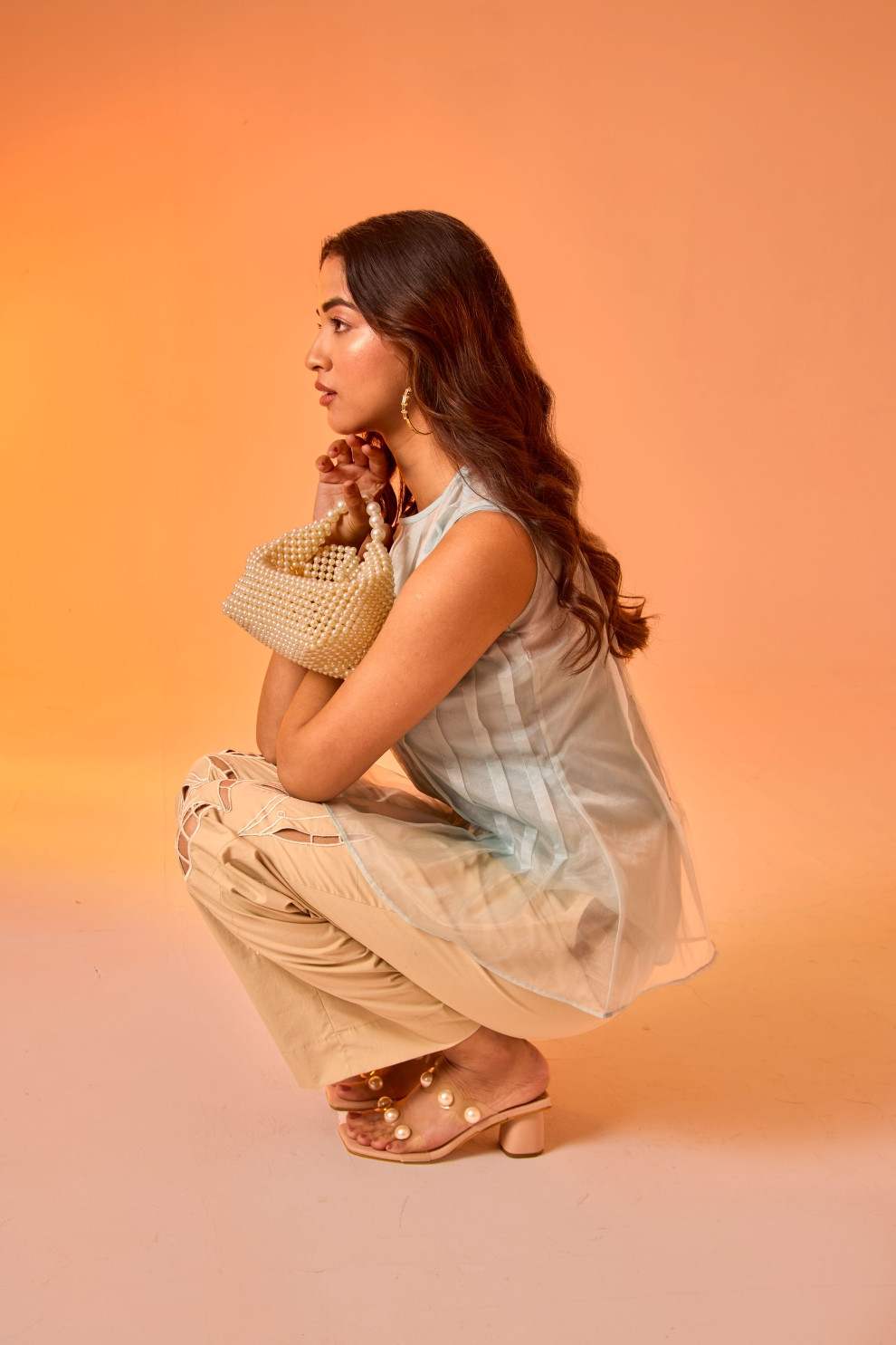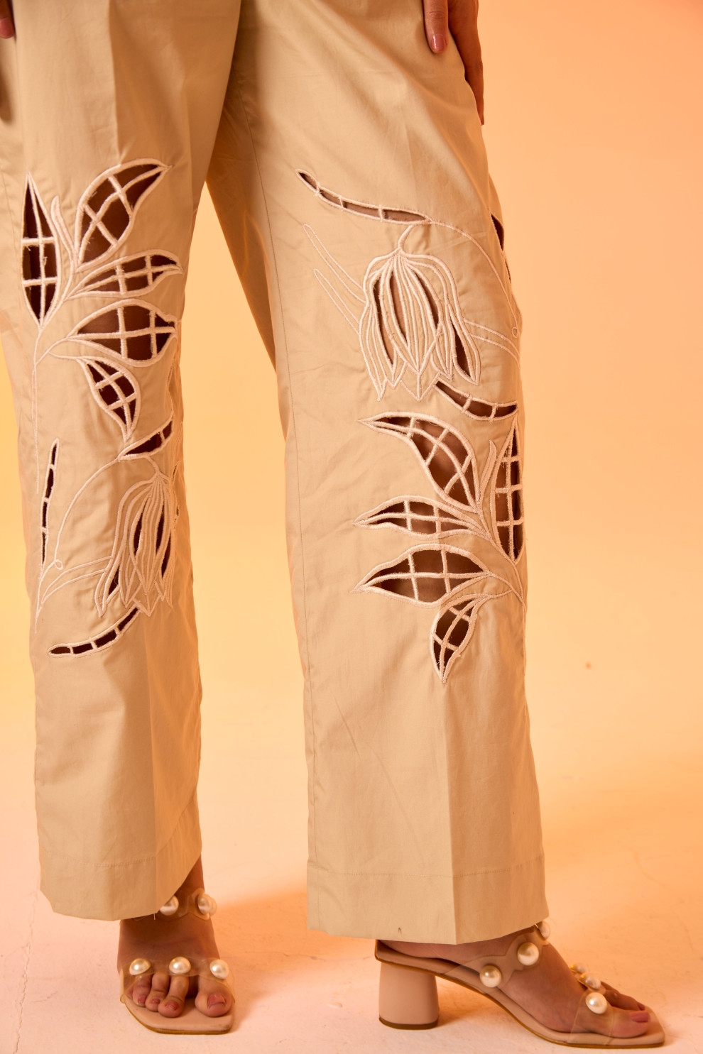 A three piece set. This organza top features a delicate knife-pleated peplum, adding a touch of structured femininity. Paired with statement cutwork relaxed pants. Comes with a matching camisole for seamless styling.