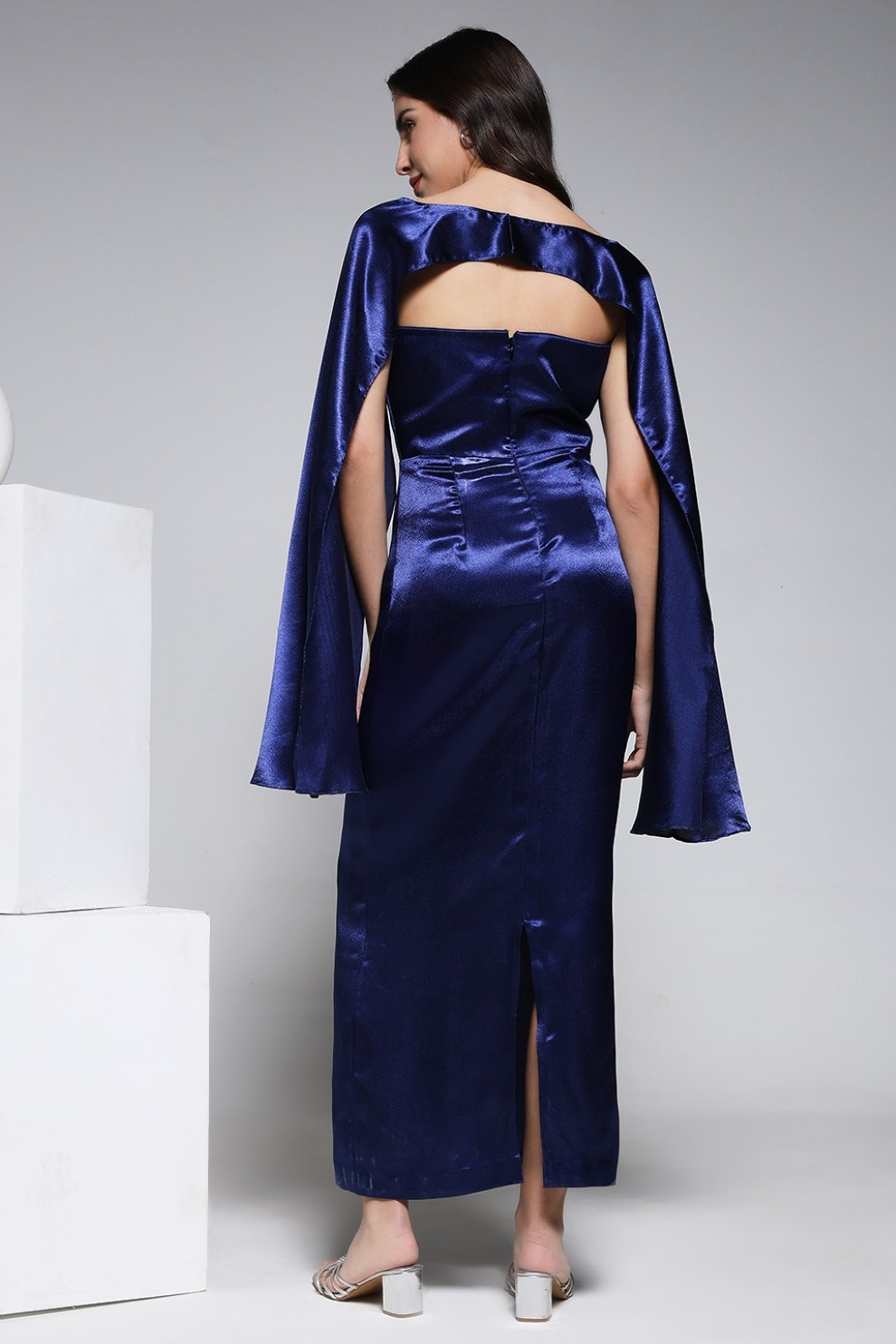 Exude elegance in this navy satin maxi, paired with a matching poncho-style scarf for a refined evening look. Perfect for timeless sophisticatio