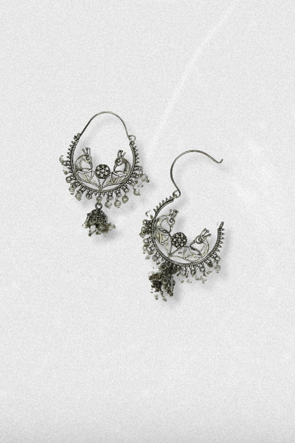 These artfully intricate oxidized hoop earrings, Showcasing twin peacock motifs delicately perched amidst floral filigree, the design bursts into a halo of textured accents and dainty ghungroo detailing. A sculpted jhumka drop anchors the piece, adding rhythmic movement and vintage allure. The antique silver tone brings out every detail with understated drama, making these earrings a statement in timeless craftsmanship. Style tip: Pair with a sleek off-shoulder blouse or structured kurta—add a bold kohl eye and let these beauties do the rest. Size : Length 5.5 cm Weight : 17 gram Material : Brass