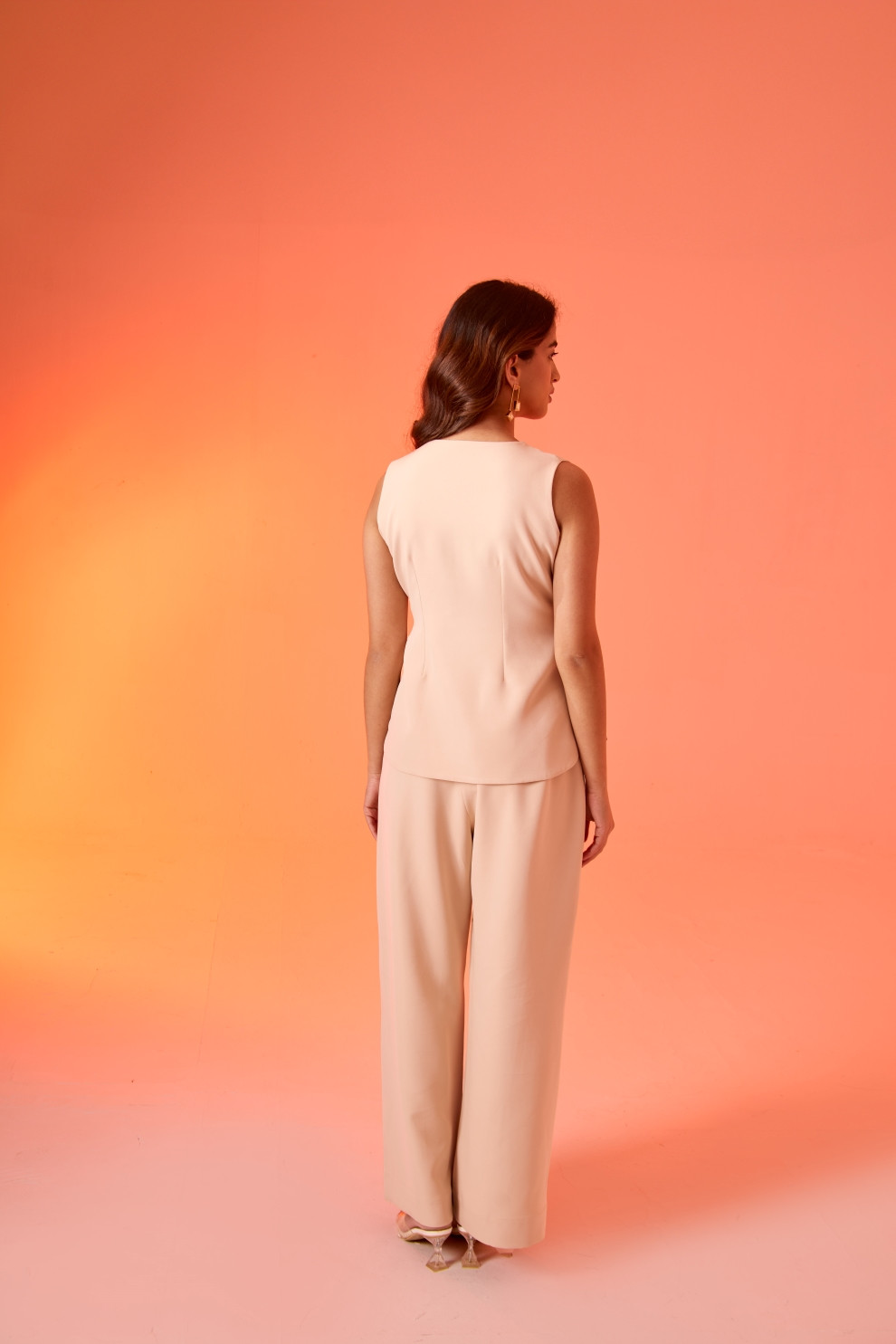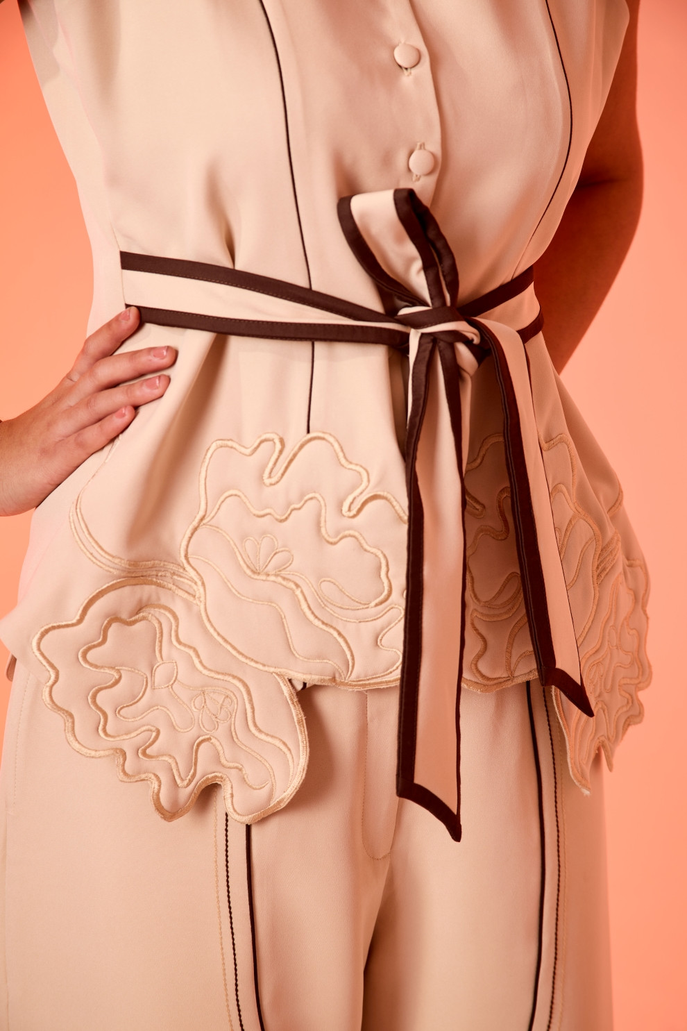 The Nyssa set is the epitome of contemporary sophistication. Featuring a top with a beautifully embossed floral hem and a statement waist tie-up, paired with color-blocked pants that showcase subtle stitchline details.