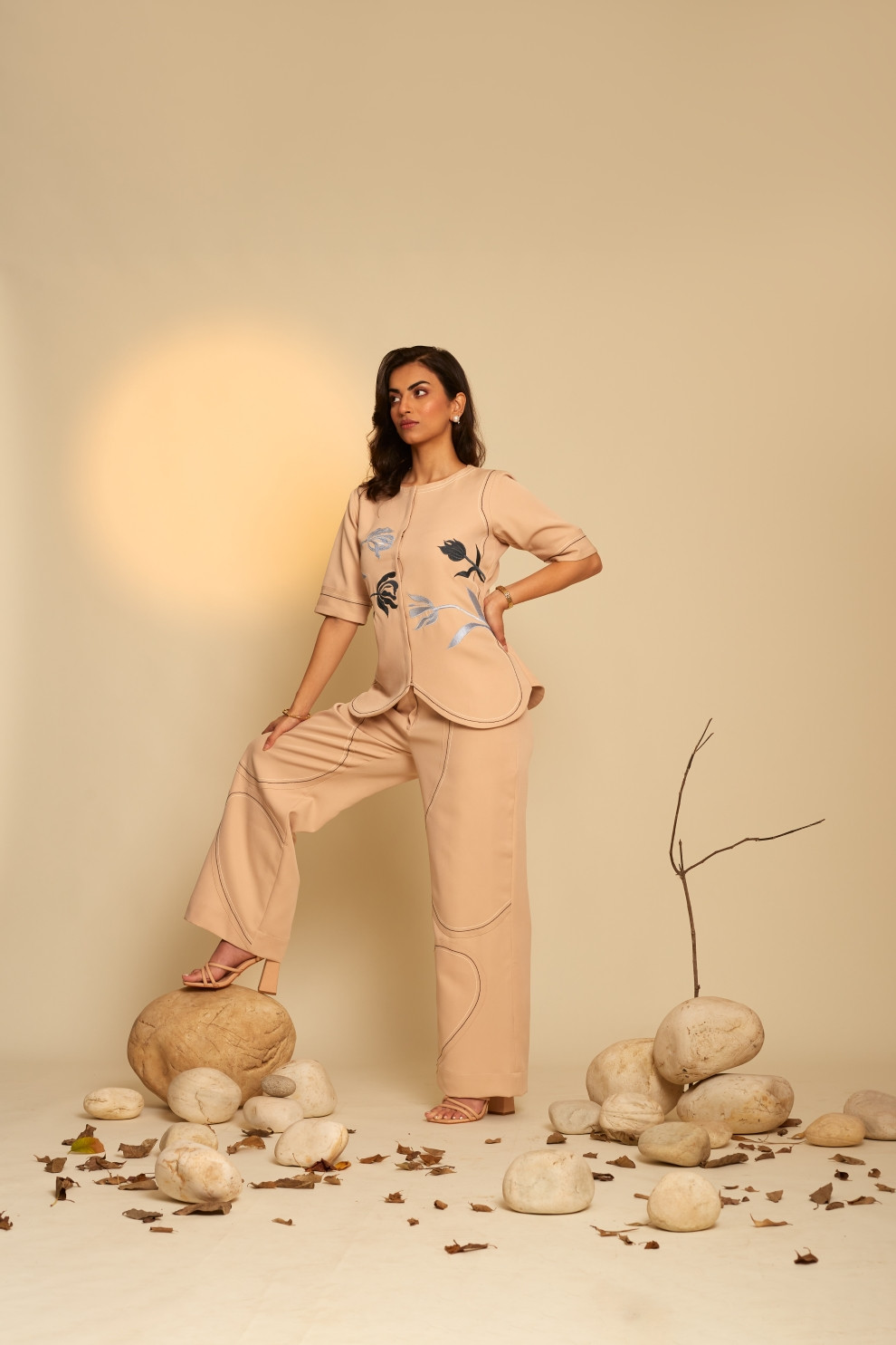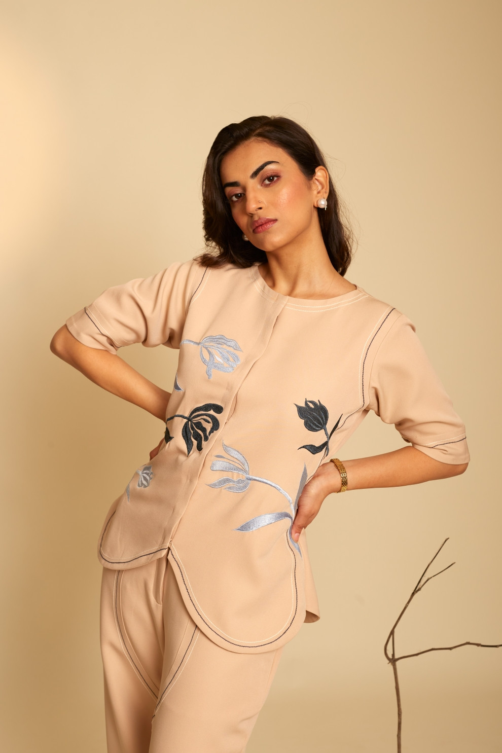The Petal co-ord set showcases a top adorned with intricate floral thread embroidery, accented by dual-shade stitch line detailing. Paired with matching pants that seamlessly integrate dark blue and cream stitch lines, this ensemble exudes a polished and sophisticated aesthetic.