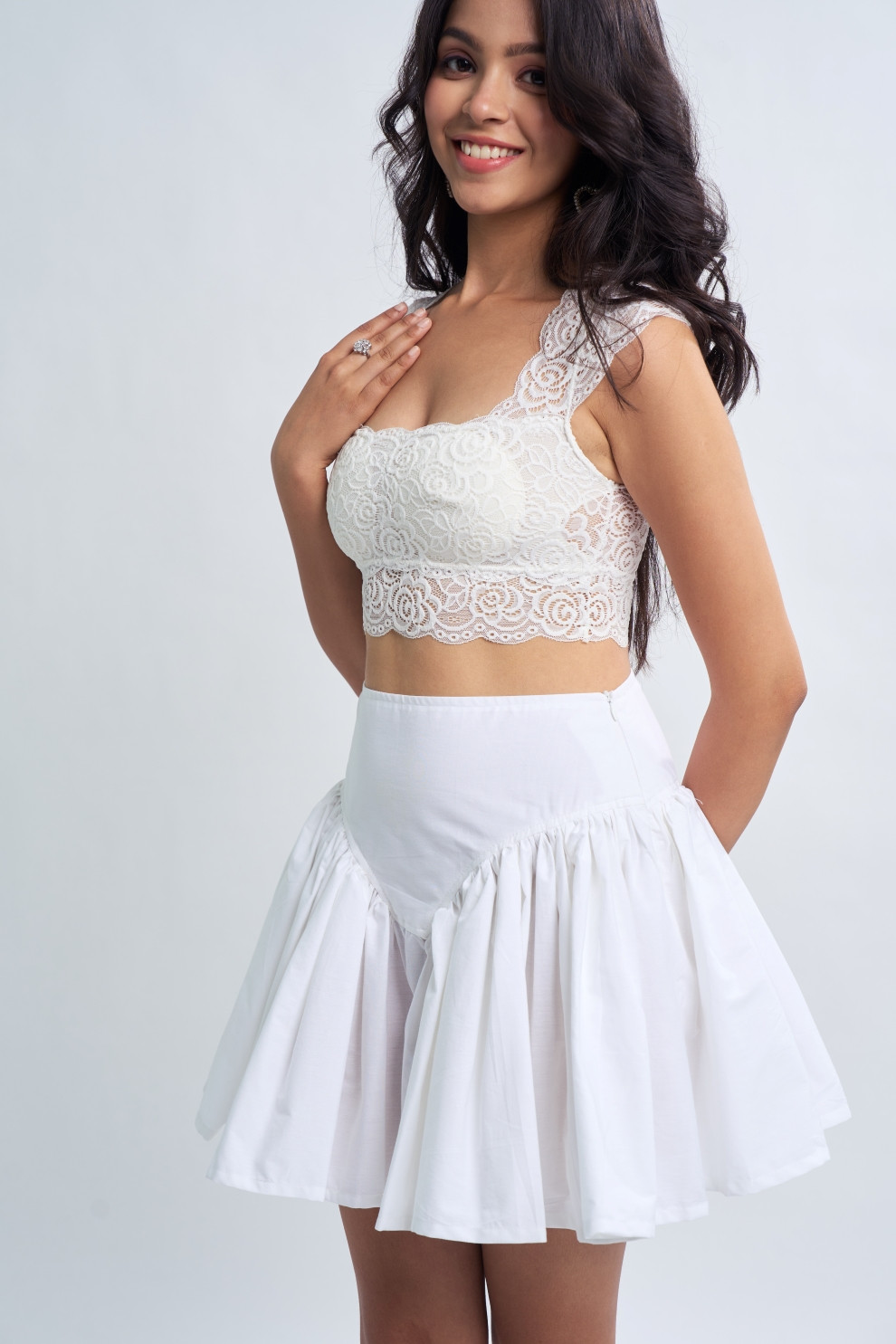 This skirt boasts a modern twist with ruching on one side, adding dynamic texture and flair. Its V-shaped waistline adds a flattering touch, accentuating the figure with a hint of sophistication.
