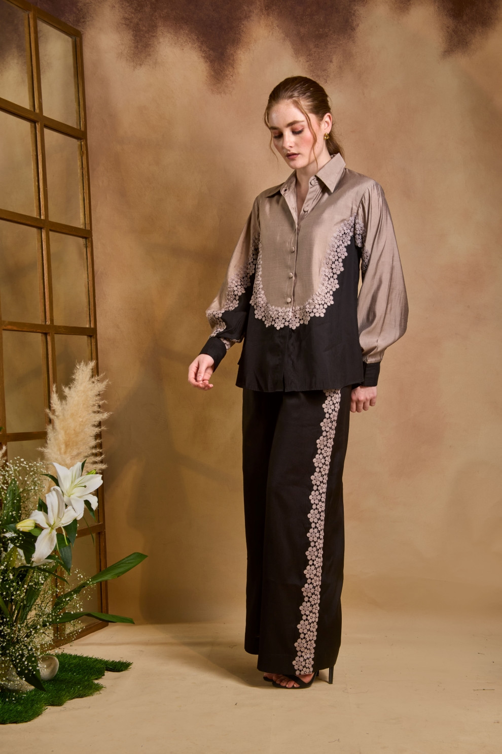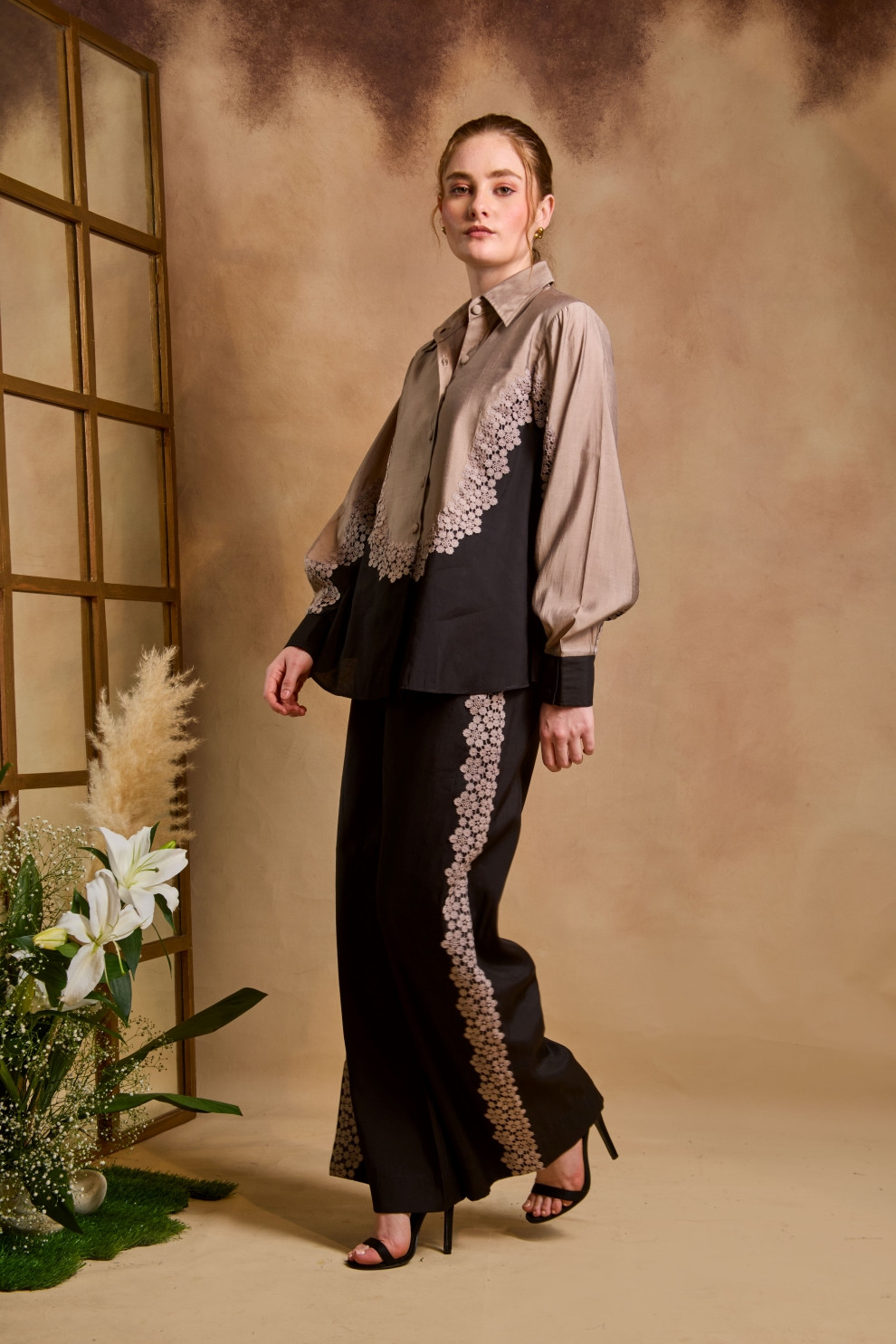 A color-blocked shirt featuring a lace-accentuated curved design, paired with straight-fit trousers detailed with lace inserts along the sides. The set blends structured tailoring with feminine detailing, creating a refined and contemporary ensemble.