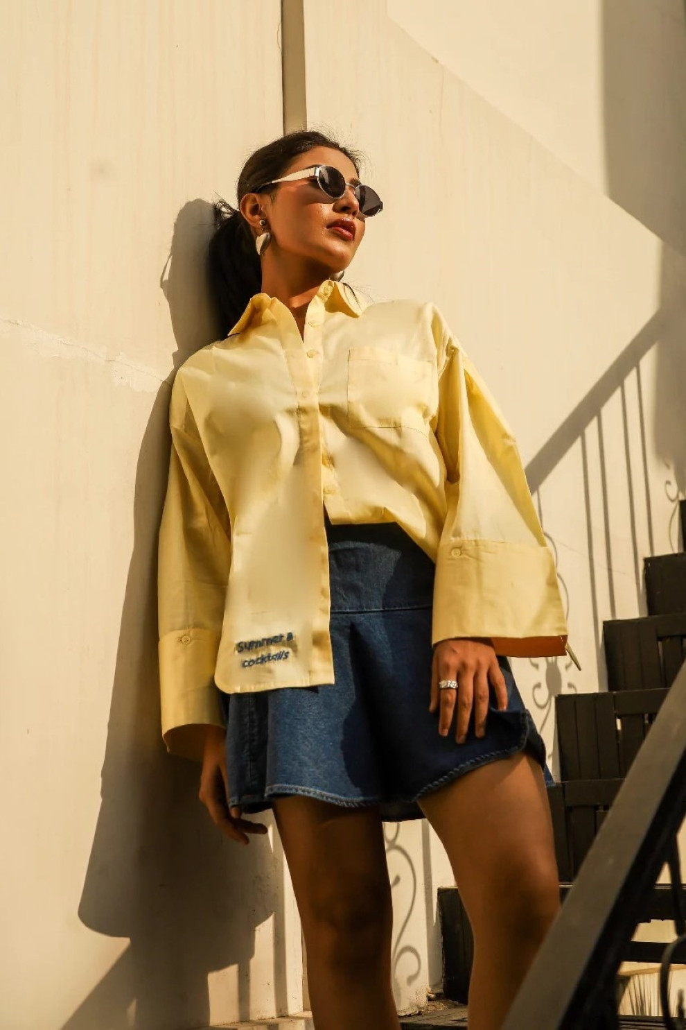 A shirt as bright and playful as a mimosa, this butter yellow piece features wide sleeves and embroidered “summer & cocktails” at the hem gives it a celebratory vibe that’s perfect for any sunny day.
