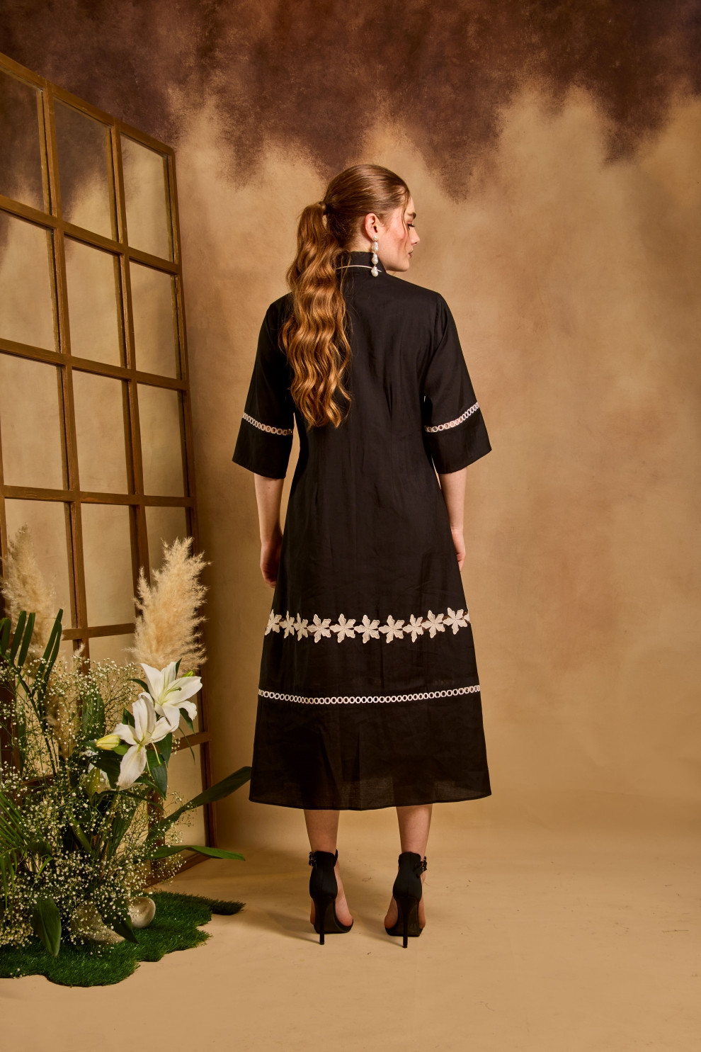 A shirt dress with a fit-and-flare silhouette, adorned with floral and geometric lace detailing and subtle embroidery accents that highlight the waistline.
