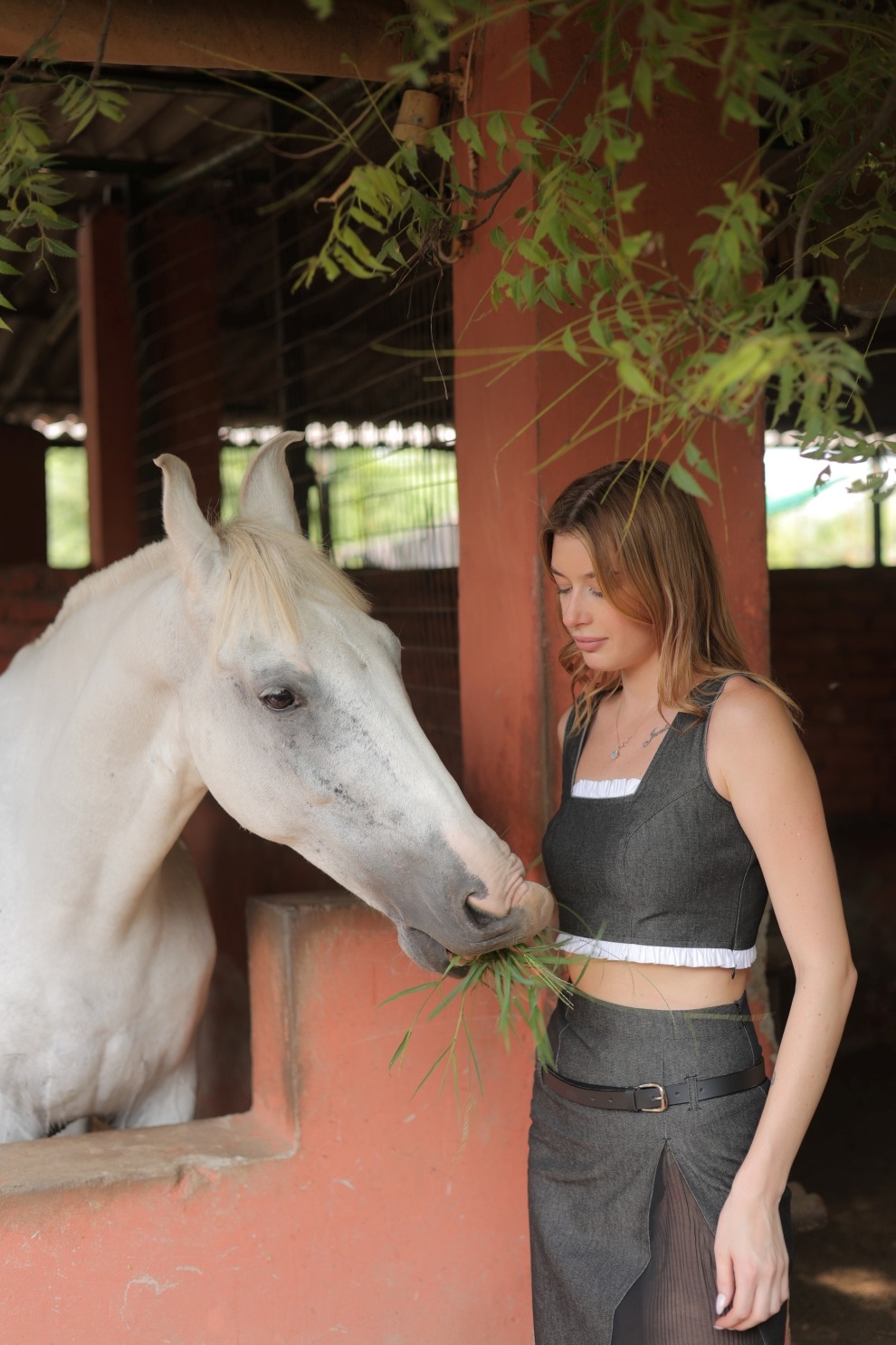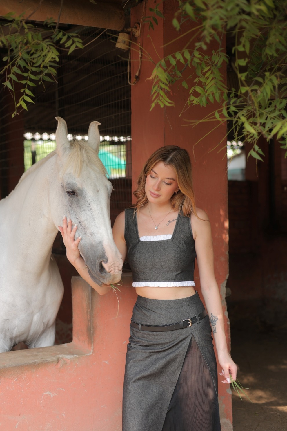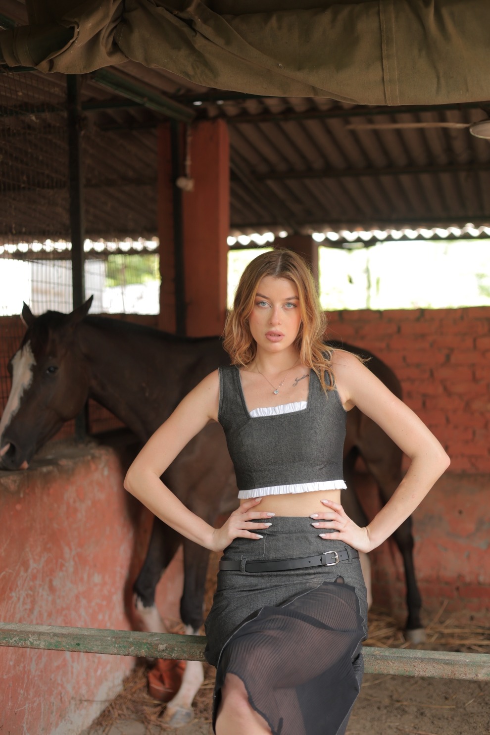 This playful top features delightful ruffles along the neckline and hem, adding a feminine touch to any outfit. Its cropped design pairs perfectly with high-waisted jeans or skirts, making it ideal for casual days.