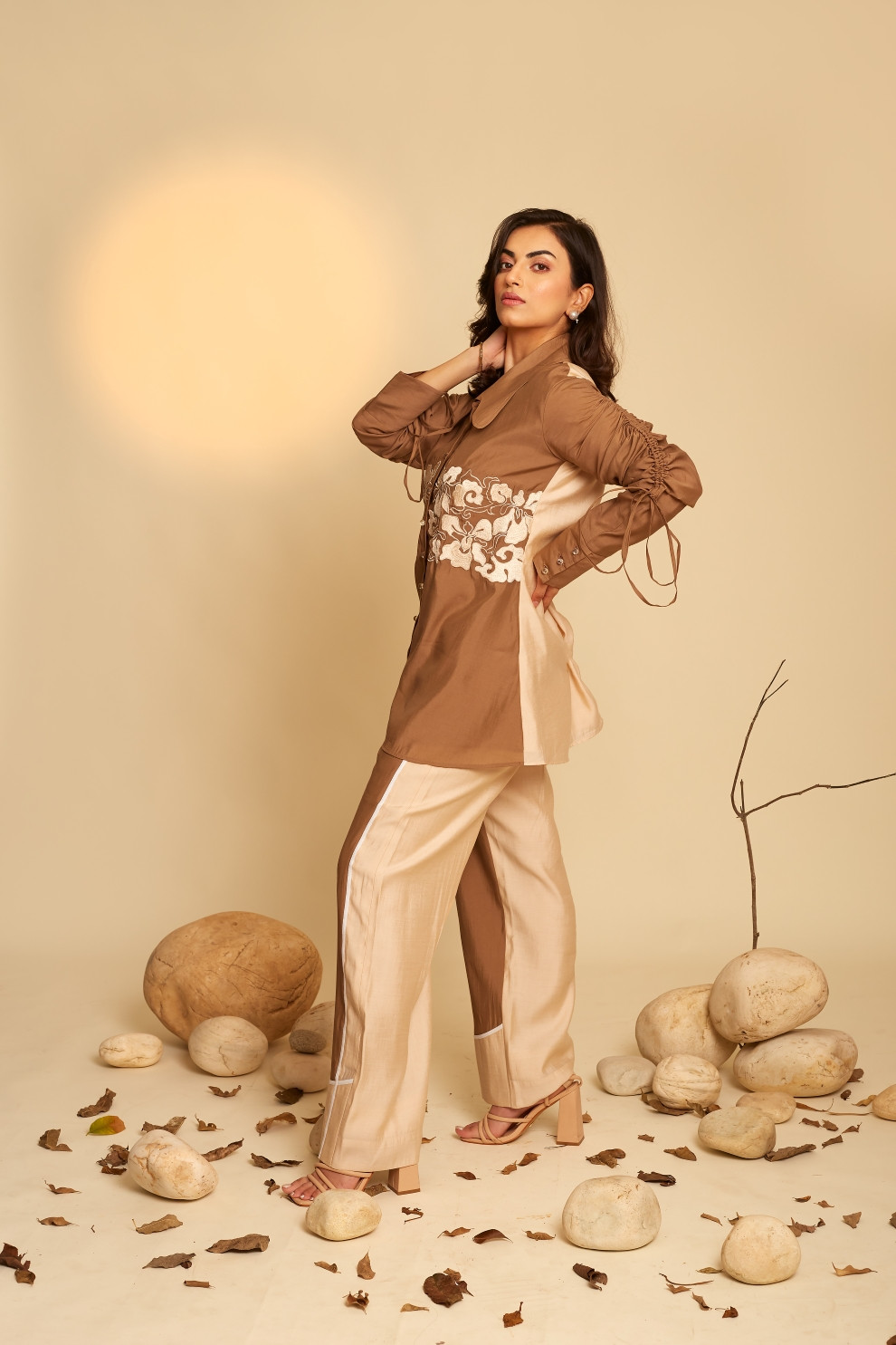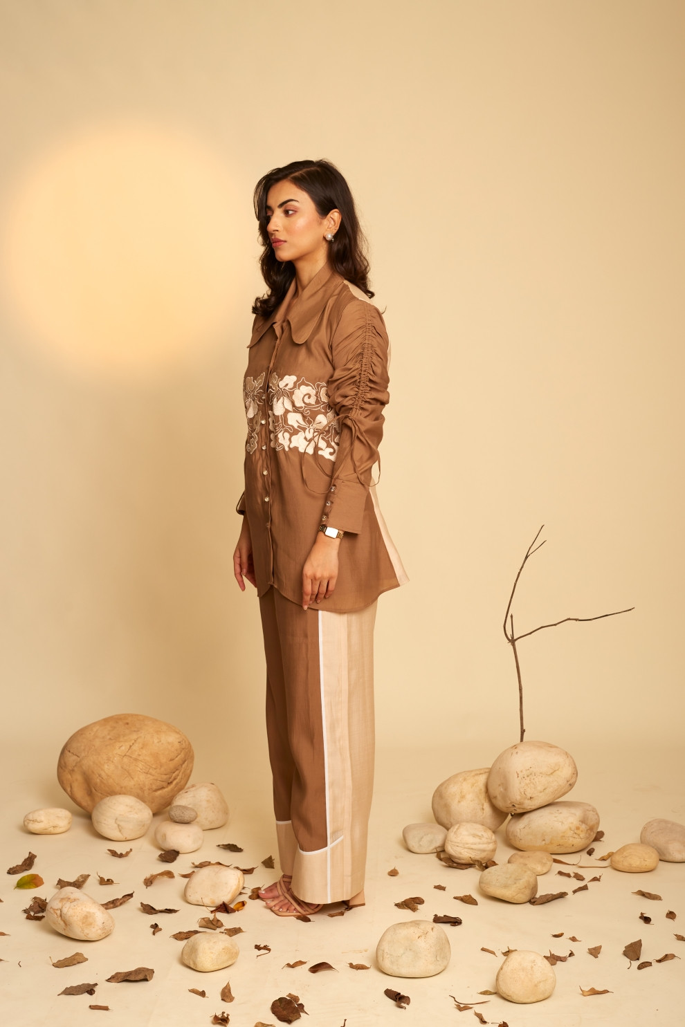 This co-ord set features a color-blocked shirt embellished with elegant front floral embroidery and distinctive ruched sleeves. It is paired with complementary color block pants and finished with a crisp white piping outline, offering a polished and harmonious look.