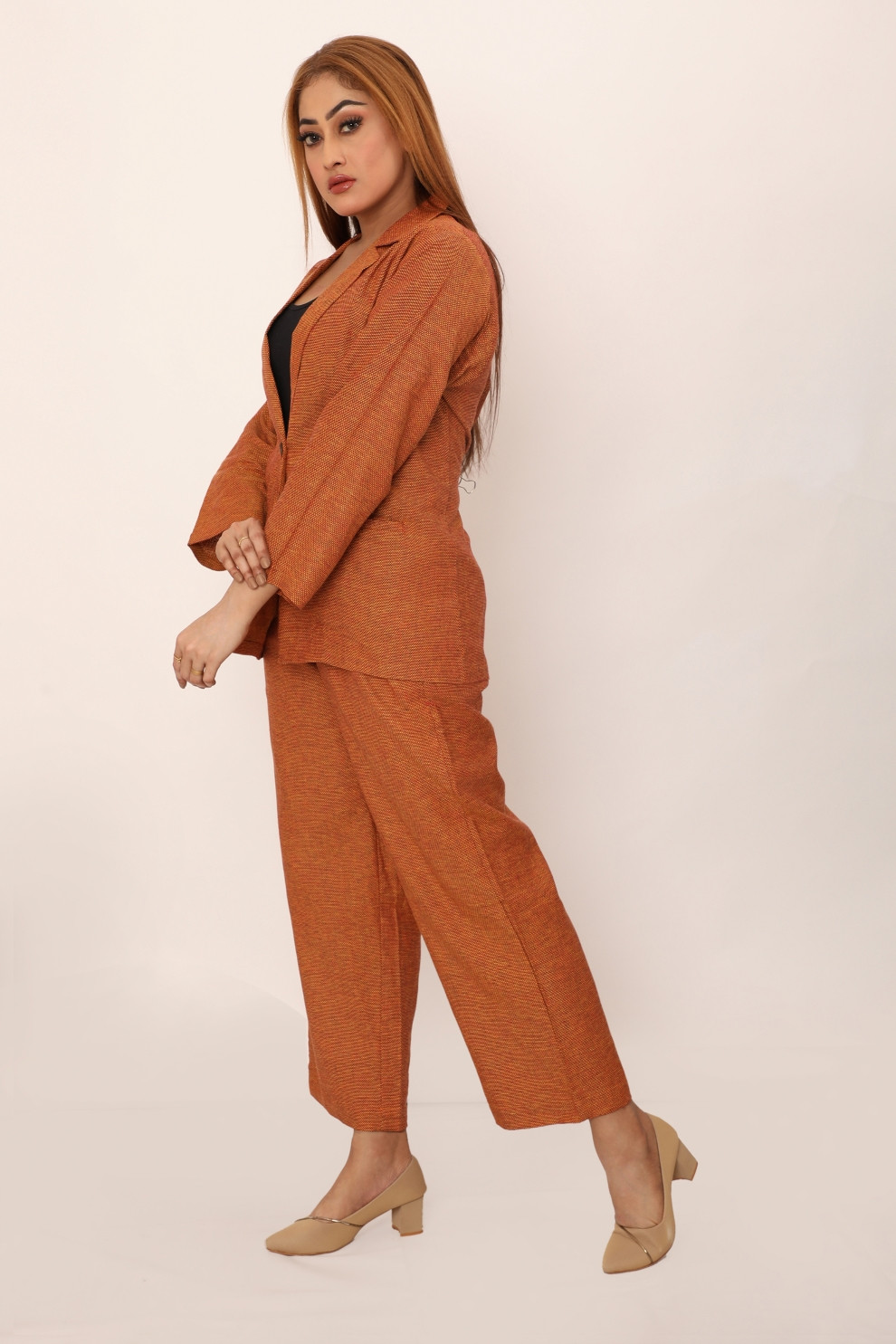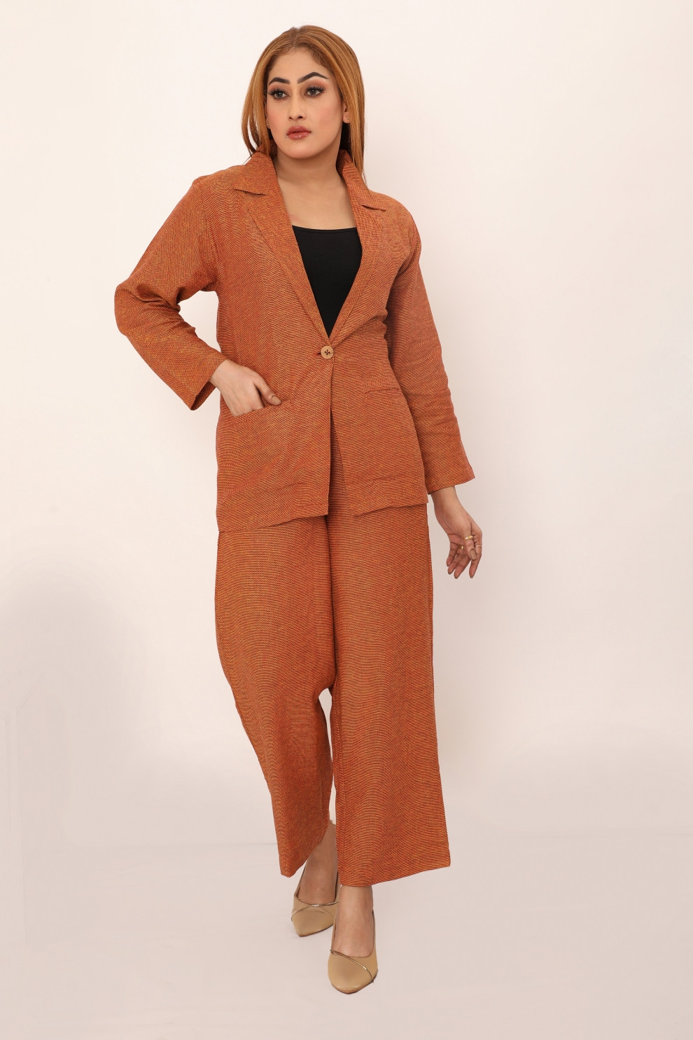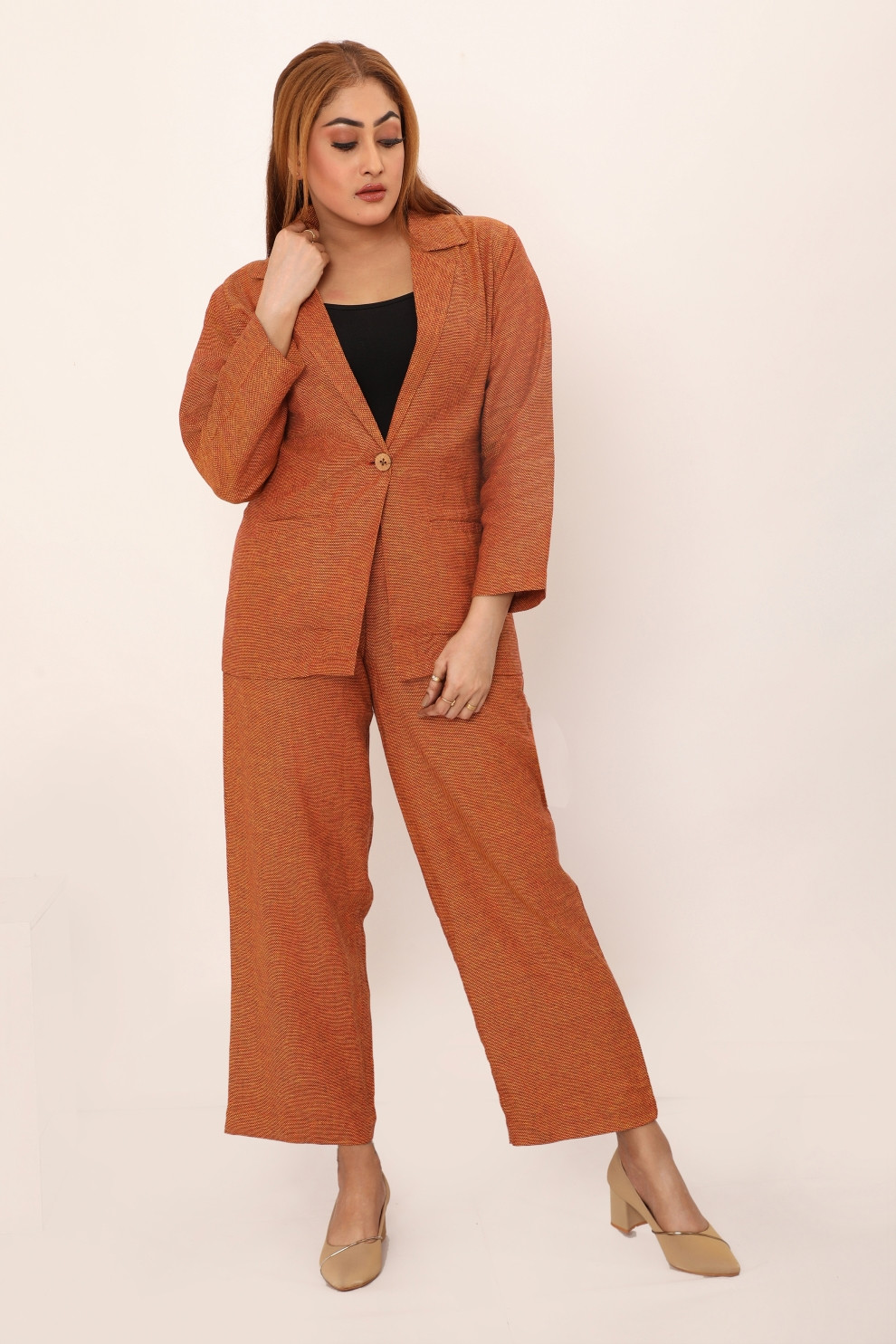 The Bella set redefines comfort and style with its relaxed yet tailored fit. This two-piece outfit features a classic blazer with a single button closure and wide lapels, paired with straight-leg trousers that offer a streamlined silhouette. Crafted from breathable fabric, this set is designed for versatility, making it perfect for workdays, casual outings, or evening events. Effortlessly chic, the Bella set combines timeless design with contemporary ease for a polished look.