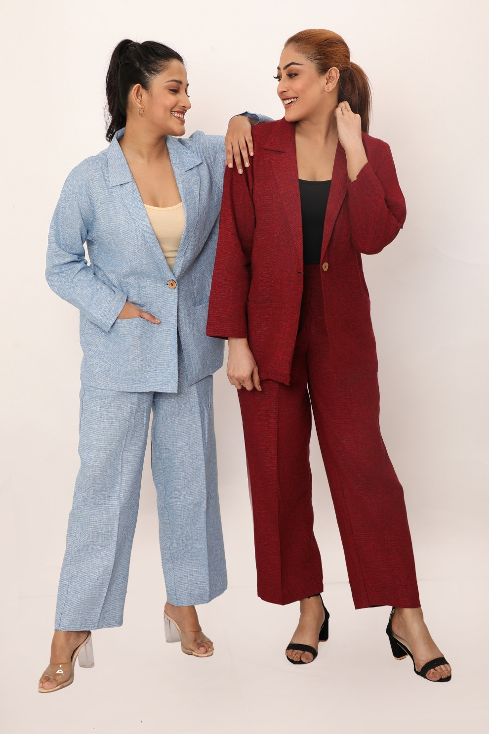 The Bella set redefines comfort and style with its relaxed yet tailored fit. This two-piece outfit features a classic blazer with a single button closure and wide lapels, paired with straight-leg trousers that offer a streamlined silhouette. Crafted from breathable fabric, this set is designed for versatility, making it perfect for workdays, casual outings, or evening events. Effortlessly chic, the Bella set combines timeless design with contemporary ease for a polished look.