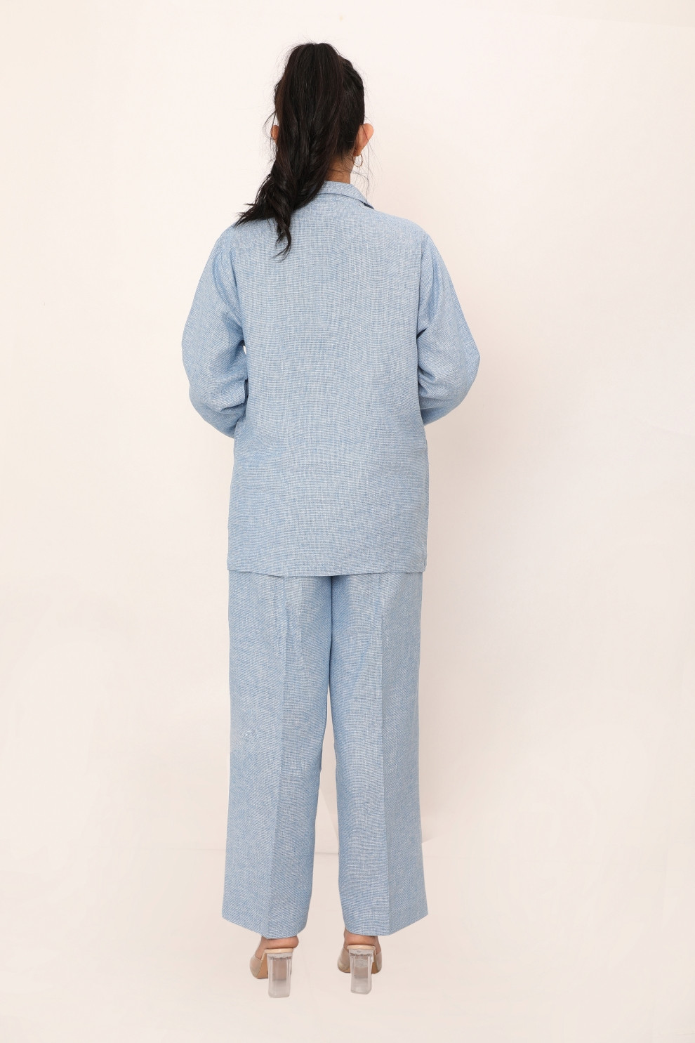 The Bella set redefines comfort and style with its relaxed yet tailored fit. This two-piece outfit features a classic blazer with a single button closure and wide lapels, paired with straight-leg trousers that offer a streamlined silhouette. Crafted from breathable fabric, this set is designed for versatility, making it perfect for workdays, casual outings, or evening events. Effortlessly chic, the Bella set combines timeless design with contemporary ease for a polished look.